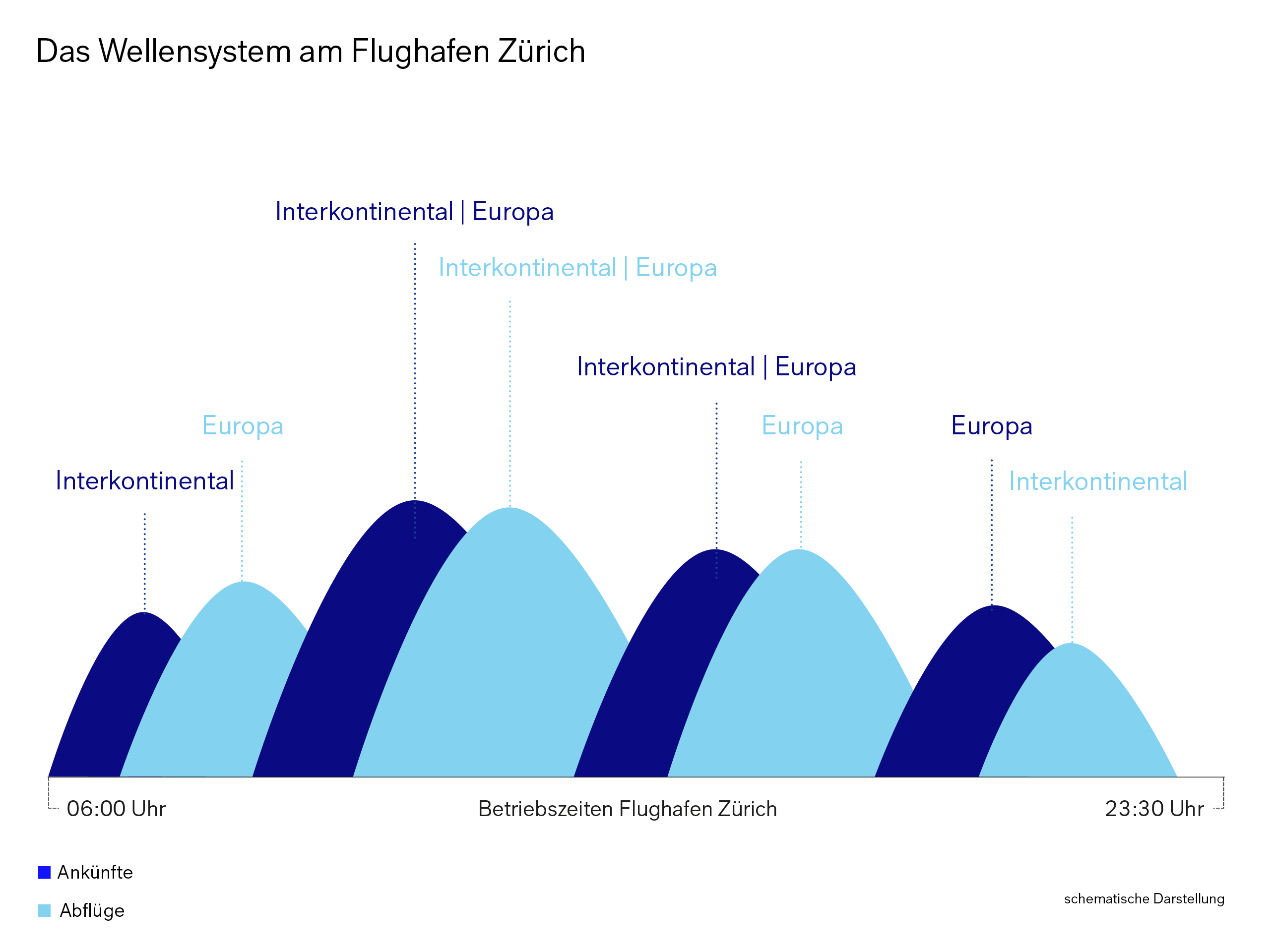 Diese Effizienzsteigerung ist grösseren und besser ausgelasteten Flugzeugen zu verdanken. Ein weiterer Grund für die am Flughafen Zürich mit über 82 % überdurchschnittlich hohe Auslastung: der Hubbetrieb der SWISS. Dieser zeichnet sich durch ein fein getimtes Netz von Kurz-, Mittel- und Langstreckenflügen aus. Kurz- und Mittelstrecken dienen dabei insbesondere auch als Zubringer für die Langstrecken (analog S-Bahn und Intercity-Zug). Umgekehrt steigen die von den Langstreckenflügen ankommenden Passagiere, welche nicht in Zürich bleiben, auf die Kurz- und Mittelstreckenverbindungen zu ihrer Zieldestination um. Das System ist komplex und eng getaktet. Betrieblich schlägt sich dies im für den Hub charakteristischen Wellensystem nieder, sprich einer Konzentration von ankommenden und abfliegenden Flügen während der Spitzenzeiten.