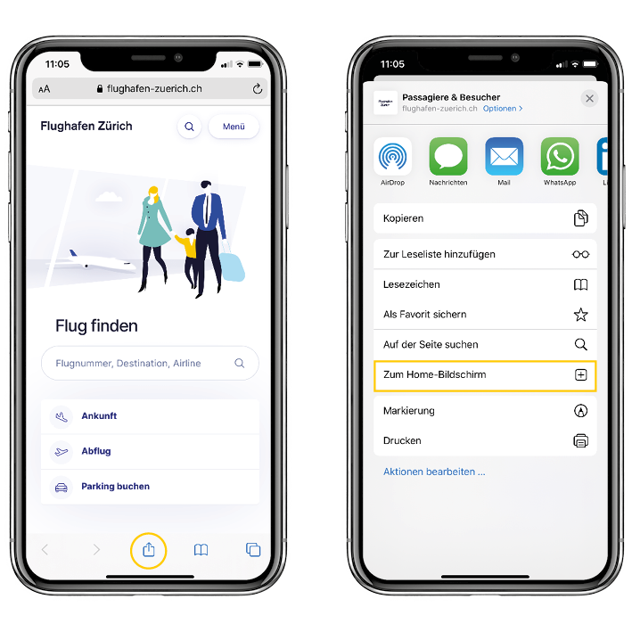 Erstellen Sie in fünf einfachen Schritten eine Verknüpfung auf Ihrem Startbildschirm. Die Webseite des Flughafen Zürich erscheint dann als App-Symbol auf dem Startbildschirm. Die Webseite können Sie anschliessend wie eine App nutzen.