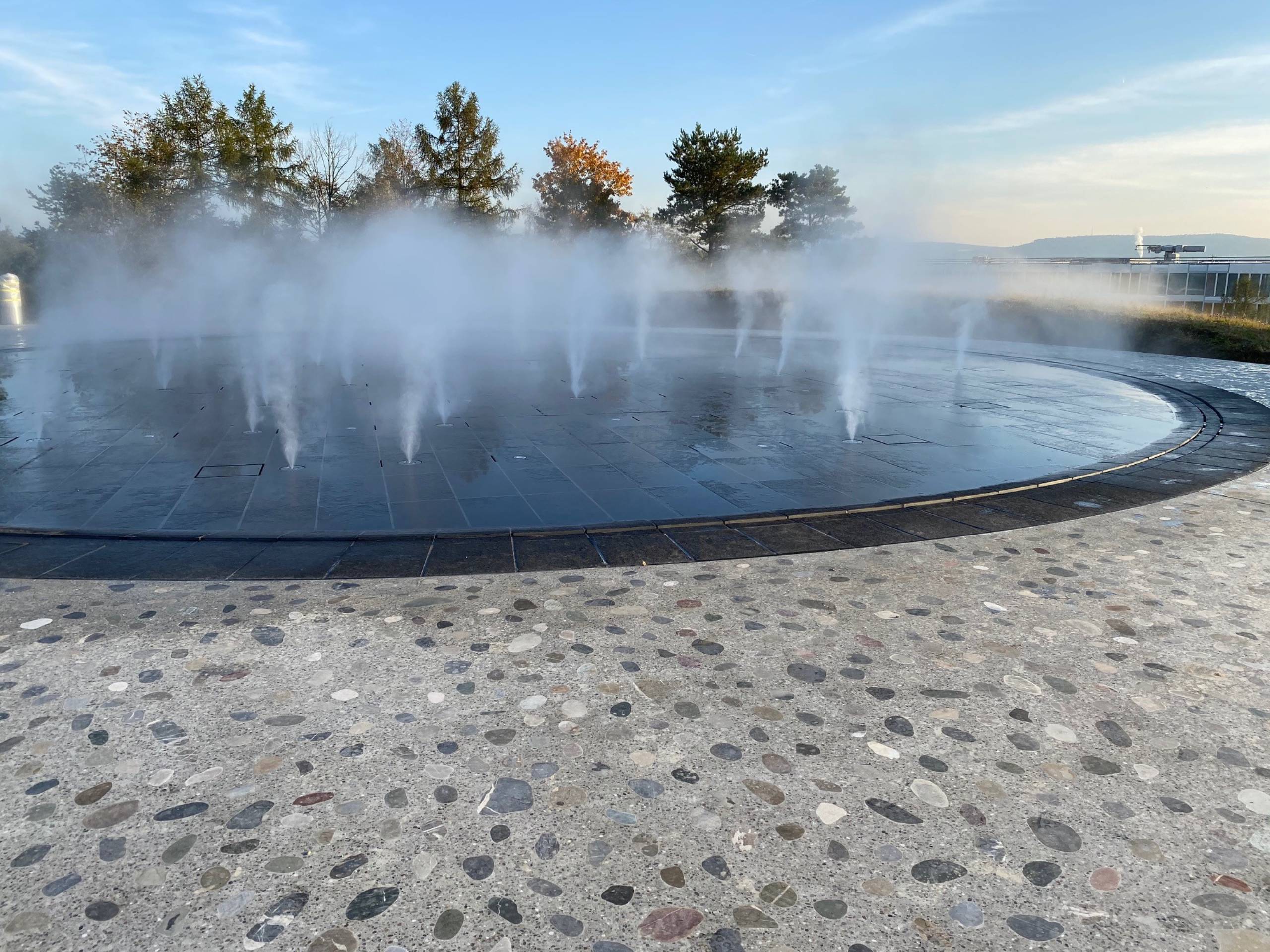 Am höchsten Punkt im Park bietet sich eine Aussicht über den Circle und an klaren Tagen bis hin zu den Alpen. In den Sommermonaten spiegeln sich die Wolken am Himmel in der Wasseroberfläche. Wassernebel sorgt zudem für eine kühlende Atmosphäre. Im Winter wird die Plattform durch stimmungsvolle Lampen beleuchtet.