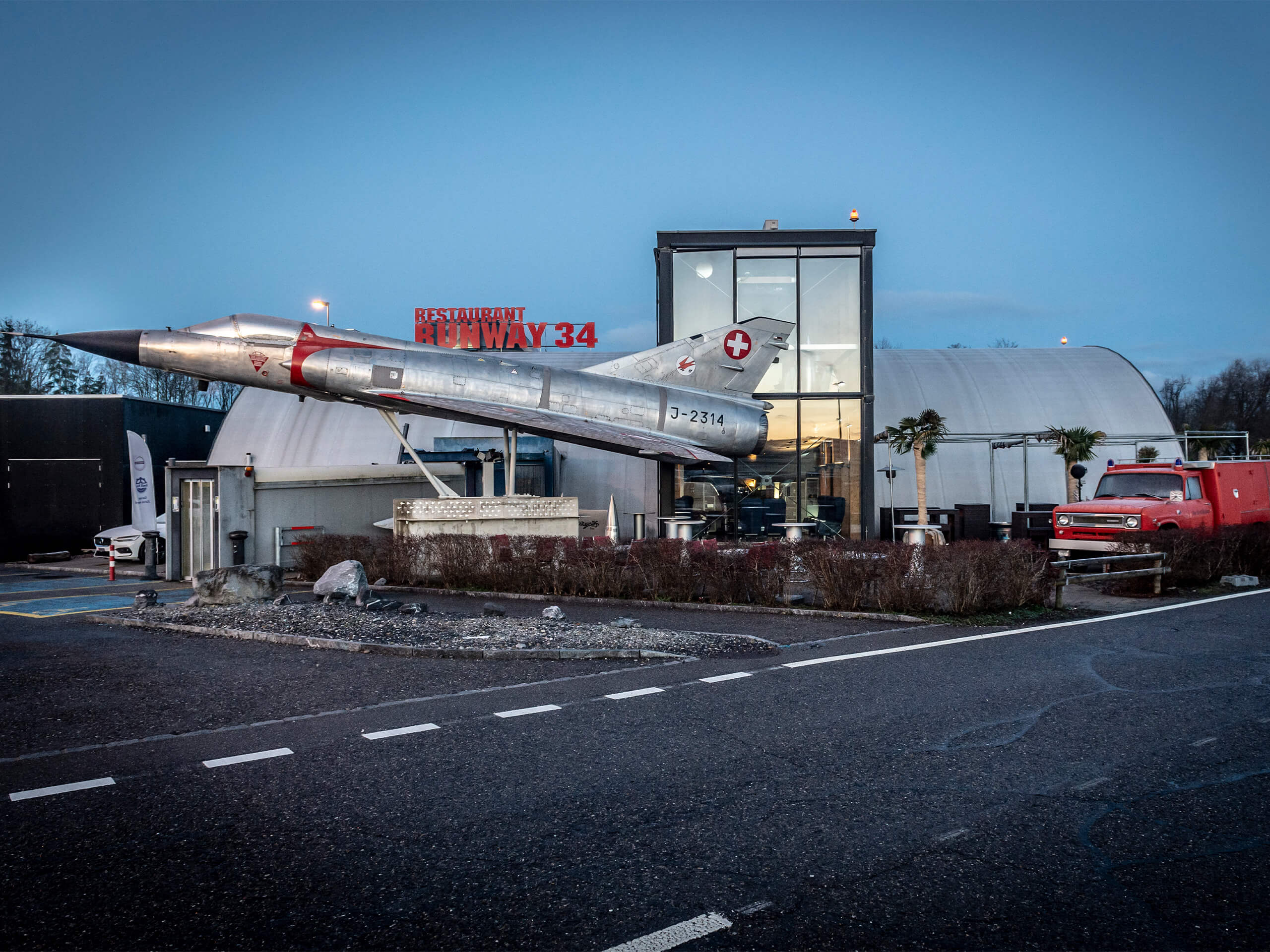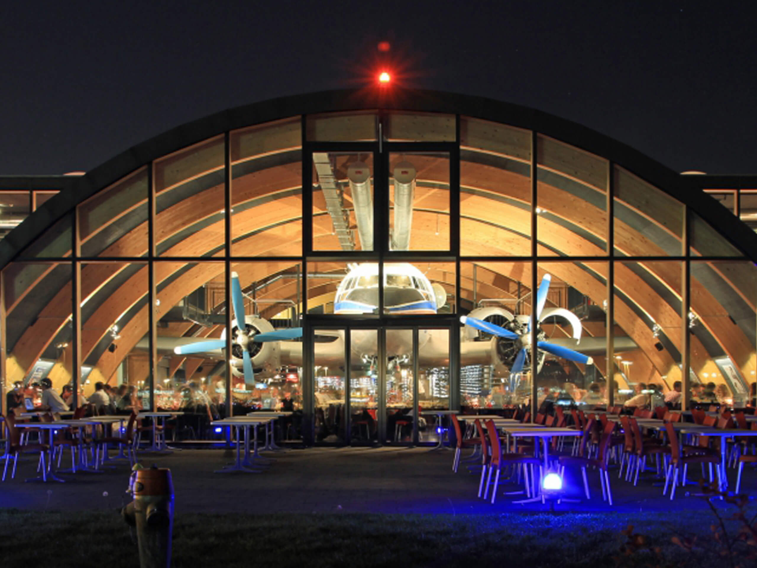 Hier wird das Fliegen gelebt. Das Erlebnisrestaurant ist um ein Flugzeug – eine Original-Ilyushin14 – herum in Form eines Hangars gebaut. Im Sommer lädt die Terrasse zum Verweilen ein – der perfekte Stopp für Ihre Tour rund um den Flughafen.