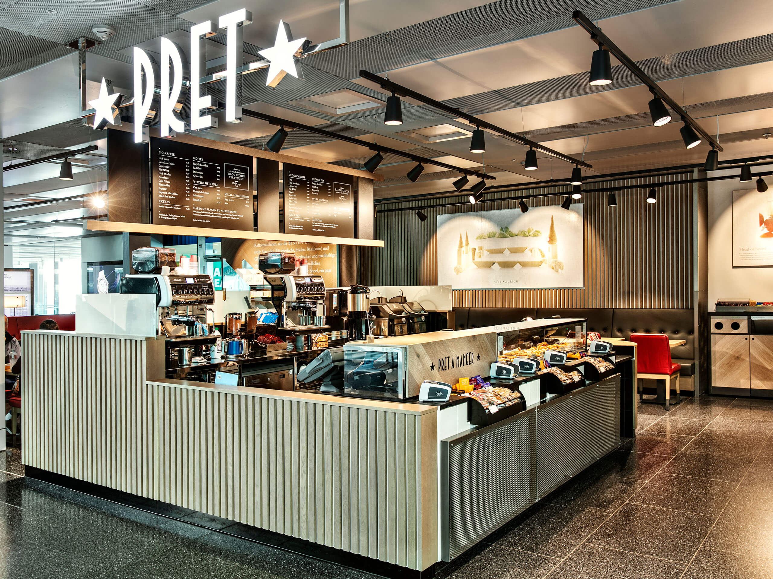 Täglich frische Speisen mit besten Zutaten – das zeichnet Pret A Manger aus. Das vielfältige Angebot der internationalen Gastronomiemarke umfasst unter anderem klassische Sandwiches, Wraps, vegane Mahlzeiten sowie warme und kalte Getränke, die vor Ort konsumiert oder zum Mitnehmen bestellt werden können.