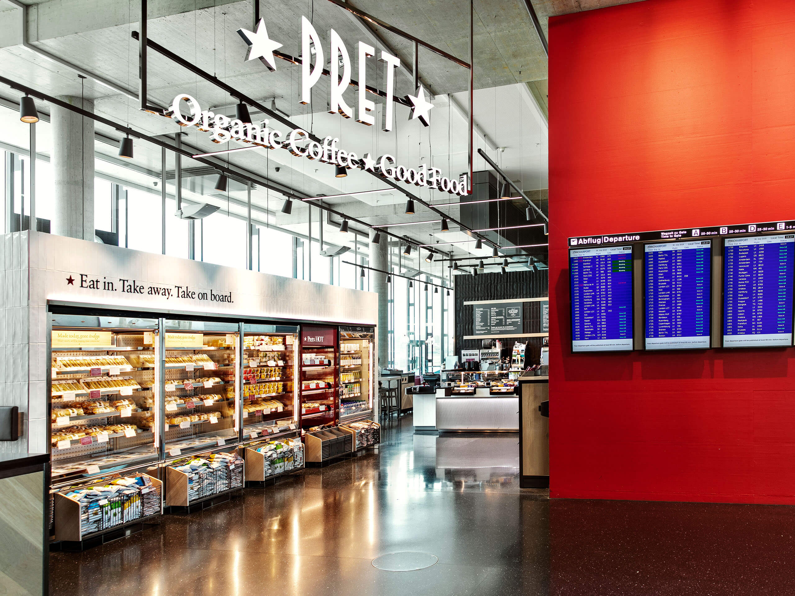 Täglich frische Speisen mit besten Zutaten – das zeichnet Pret A Manger aus. Das vielfältige Angebot der internationalen Gastronomiemarke umfasst unter anderem klassische Sandwiches, Wraps, vegane Mahlzeiten sowie warme und kalte Getränke, die vor Ort konsumiert oder zum Mitnehmen bestellt werden können.
