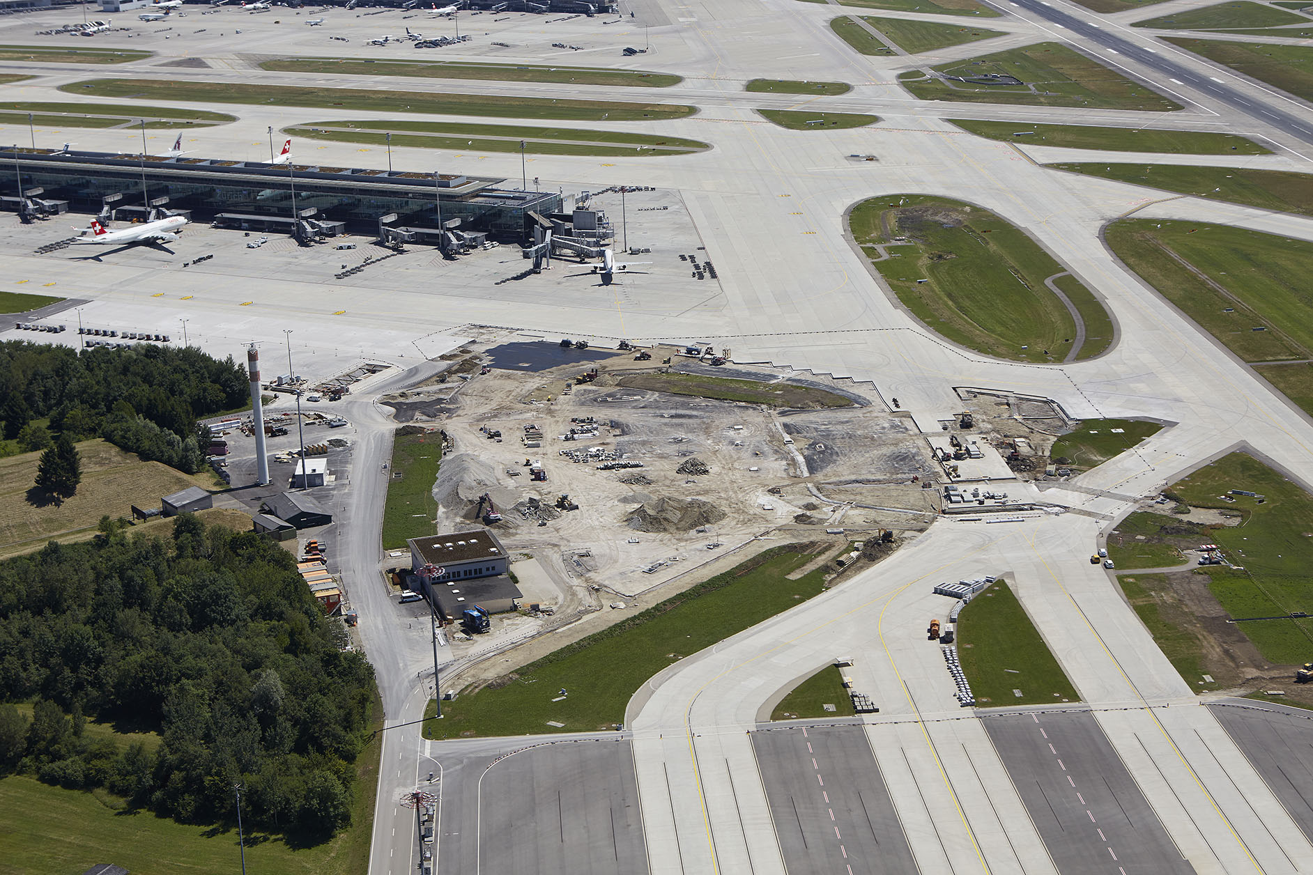 Da die beengten Platzverhältnisse des Vorfeldes südlich der Piste 10/28 die gleiche Zahl an Standplätzen für den neuen Flugzeugtyp nicht zulassen, wurde für diesen Realersatz die Zone nördlich des Dock E ausgeschieden.