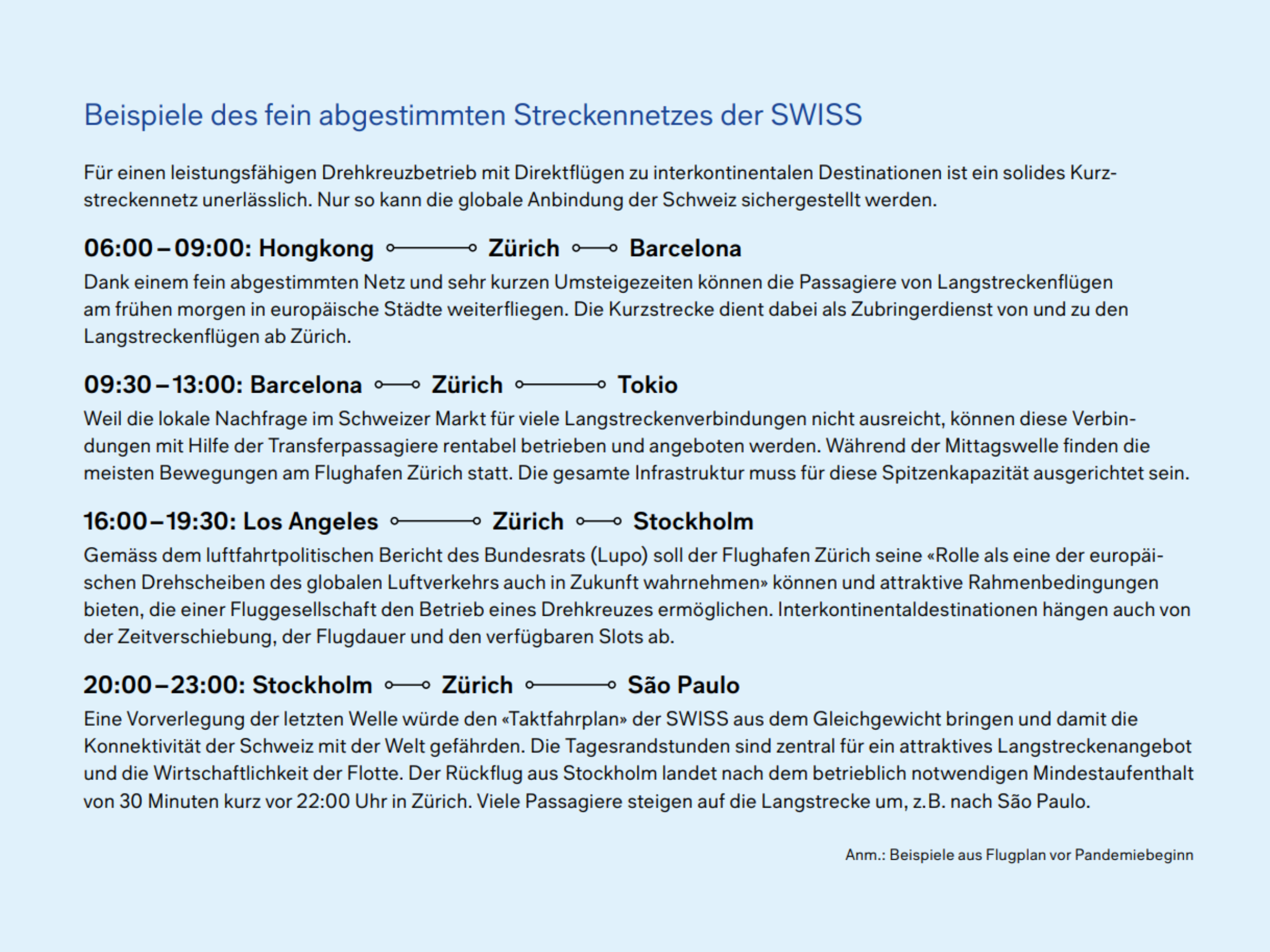 Der Drehkreuzbetrieb des Hub-Carriers SWISS am Flughafen Zürich weist sechs Wellen auf. In diesen Spitzenzeiten bestehen aufgrund verschiedener aviatischer, betrieblicher und politischer Vorschriften bereits heute Engpässe, die zu Verspätungen führen. Gerade eine Vorverlegung der letzten (Start-)Welle am Abend würde den «Taktfahrplan» der SWISS aus dem Gleichgewicht bringen und damit die Konnektivität der Schweiz mit der Welt gefährden. Die Tagesrandstunden sind zentral für ein attrakti-ves Langstreckenangebot und die Wirtschaftlichkeit der Flotte.