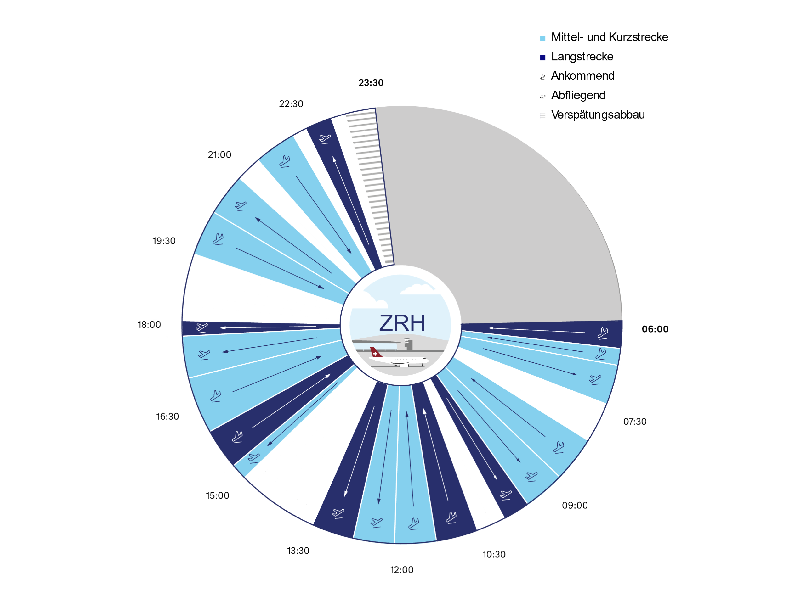 Der Hauptbahnhof Zürich mit den SBB und der Flughafen Zürich mit der SWISS haben viele Gemeinsamkeiten. Beide Infrastrukturanlagen sind für eine Spitzenkapazität zu den Hauptverkehrszeiten ausgelegt und beide Verkehrsunternehmen funktionieren nach einem Taktfahrplan. Während im Schienenverkehr ein viertel-, halb- oder stündlicher Fahrplan eingehalten werden muss, weisen die Flugpläne in der Luftfahrt einen grösseren zeitlichen Abstand auf. Hier spricht man von Wellen. An- und Abflüge der SWISS sind in insgesamt sechs Wellen organisiert, um möglichst kurze Umsteige- und attraktive Abflugzeiten garantieren zu können.