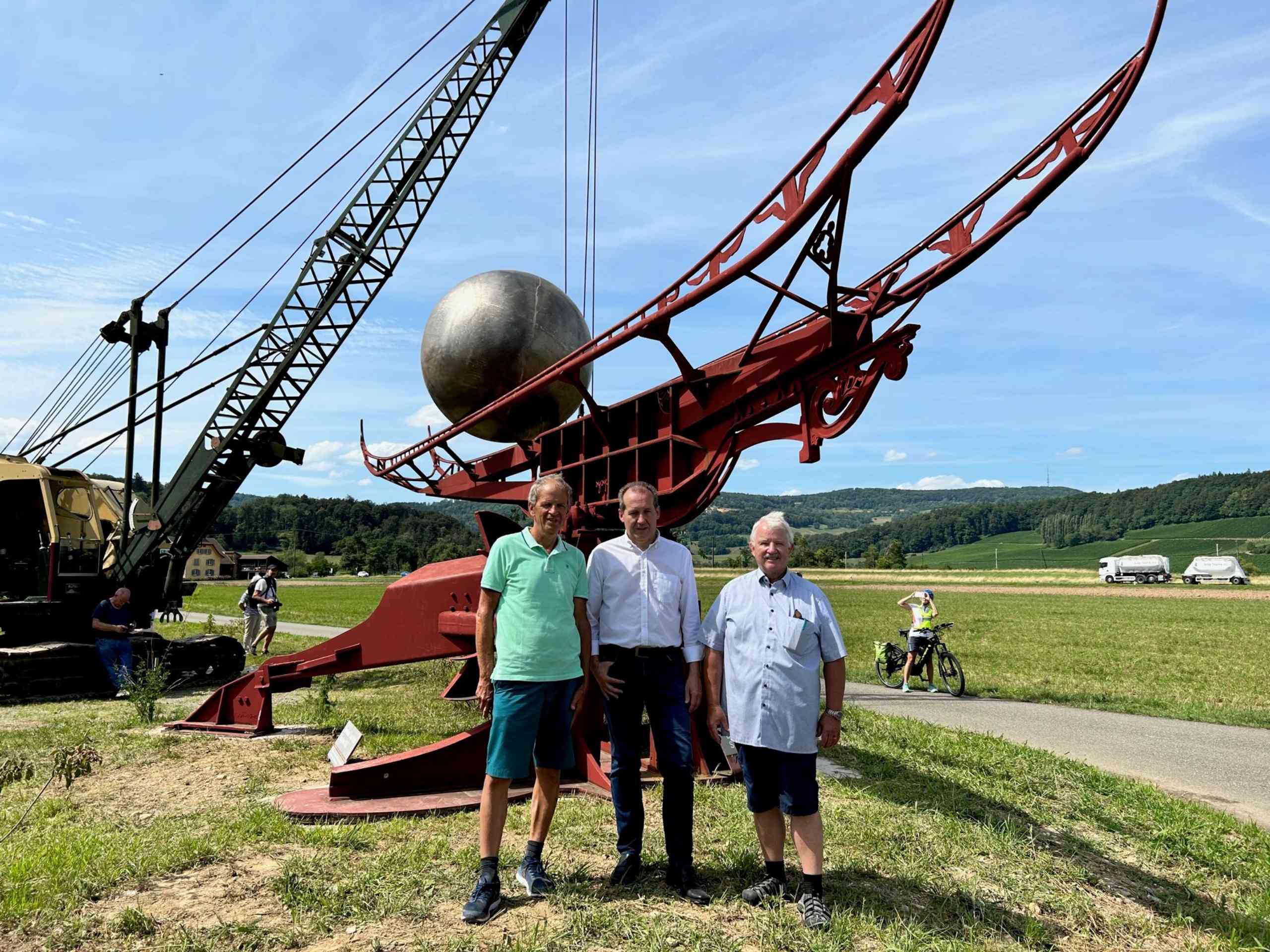 Seit Juli 2023 rollt der «Sisyphus» wieder – im Baggermuseum Ebianum in Fisibach. Auf dem Foto: Arthur Tobler (Mitte) mit den Gebrüder Heinz (links) und Hansruedi Eberhard.
