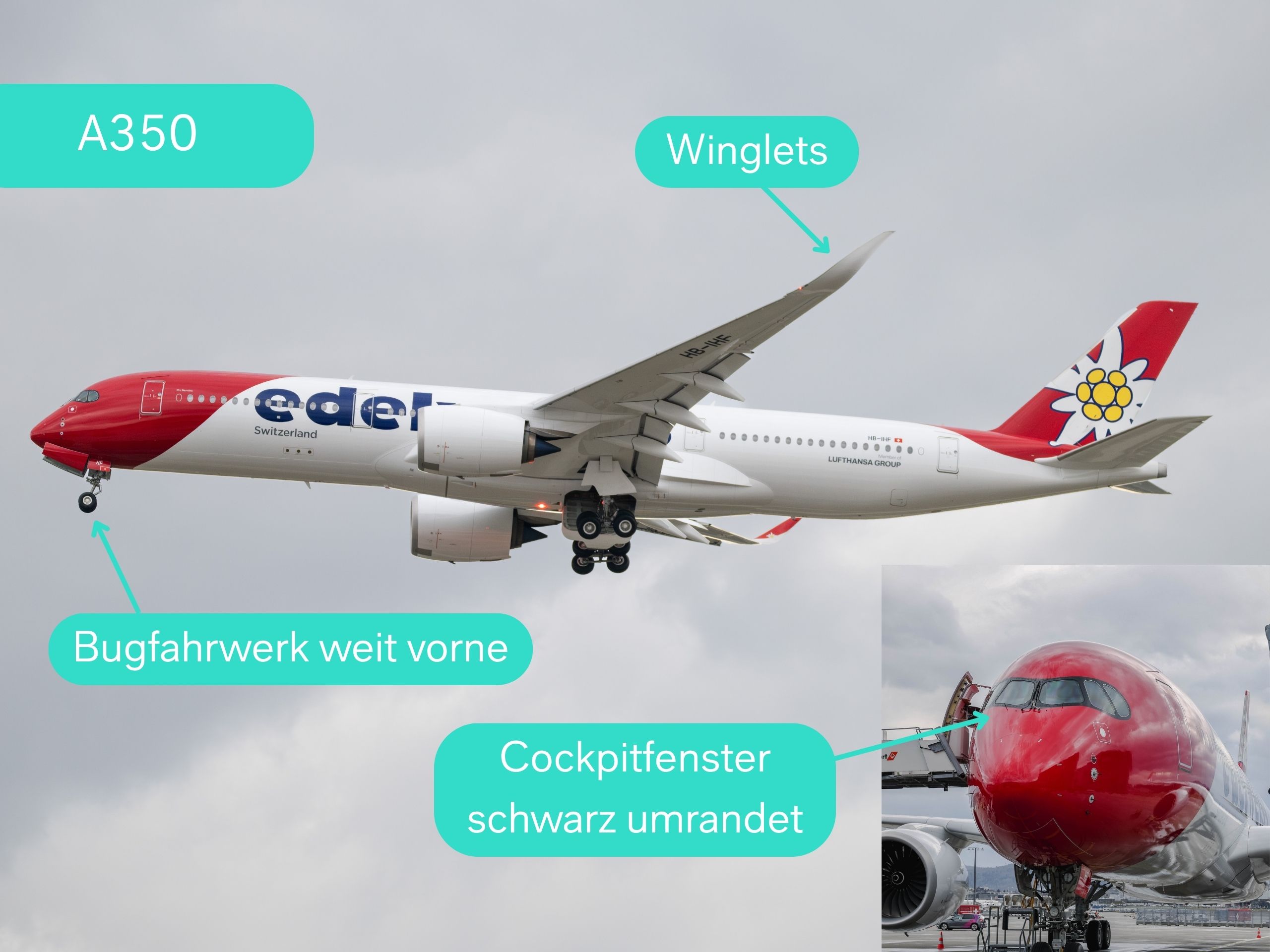 Der A350 ist der Nachfolger des A340. Auch diese Maschine ist ein Langstreckenflugzeug. Ein besonderes Merkmal bilden die Cockpitfenster: Sie sind schwarz umrandet, was auch den besonderen Spitznamen dieses Flugzeugtyps erklärt. Weitere Erkennungsmerkmale sind die elegant geschwungenen Winglets und das unter dem Cockpit weit vorne platzierte Bugfahrwerk.