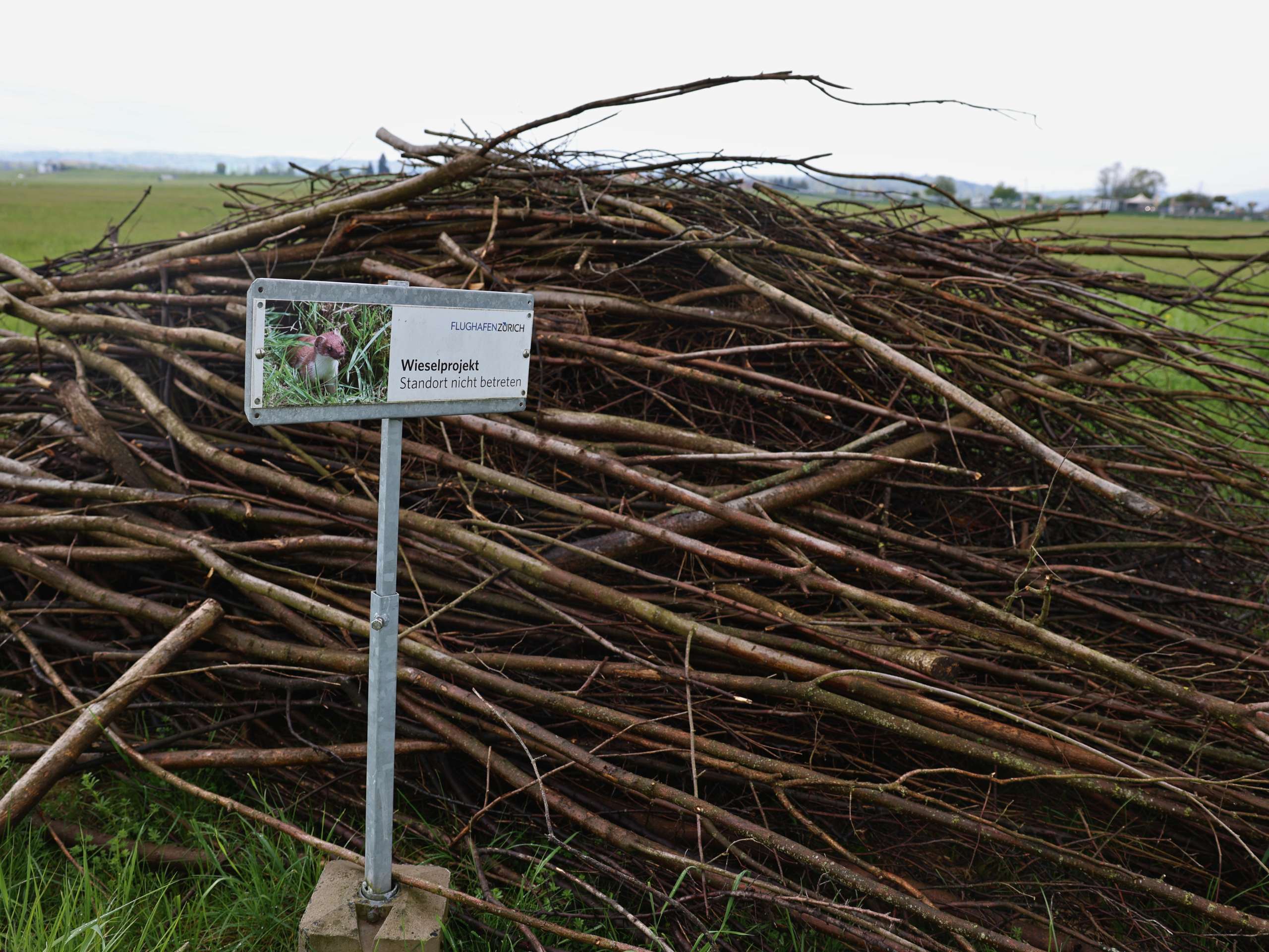 Hermeline, Mauswiesel und Iltisse sind am Flughafen Zürich willkommene Gäste. Durch ihren langgezogenen Körperbau können die stoffwechselbedingt sehr aktiven Tiere durch Mausgänge schlüpfen und diese auch unterirdisch äusserst effektiv jagen. Für das Mauswiesel und seine Verwandten wurden auf dem ganzen Flughafengelände im Zuge eines grossen Projekts zur Artenförderung über 70 Asthaufen, sogenannte Wieselburgen, aufgeschichtet. Diese bestehen aus mit Astmaterial bedeckten Kisten mit kleinem Eingang und einem Blechdach. Die Wieselburgen dienen als witterungsgeschützer Unterschlupf und Aufzuchtplatz für den Nachwuchs.