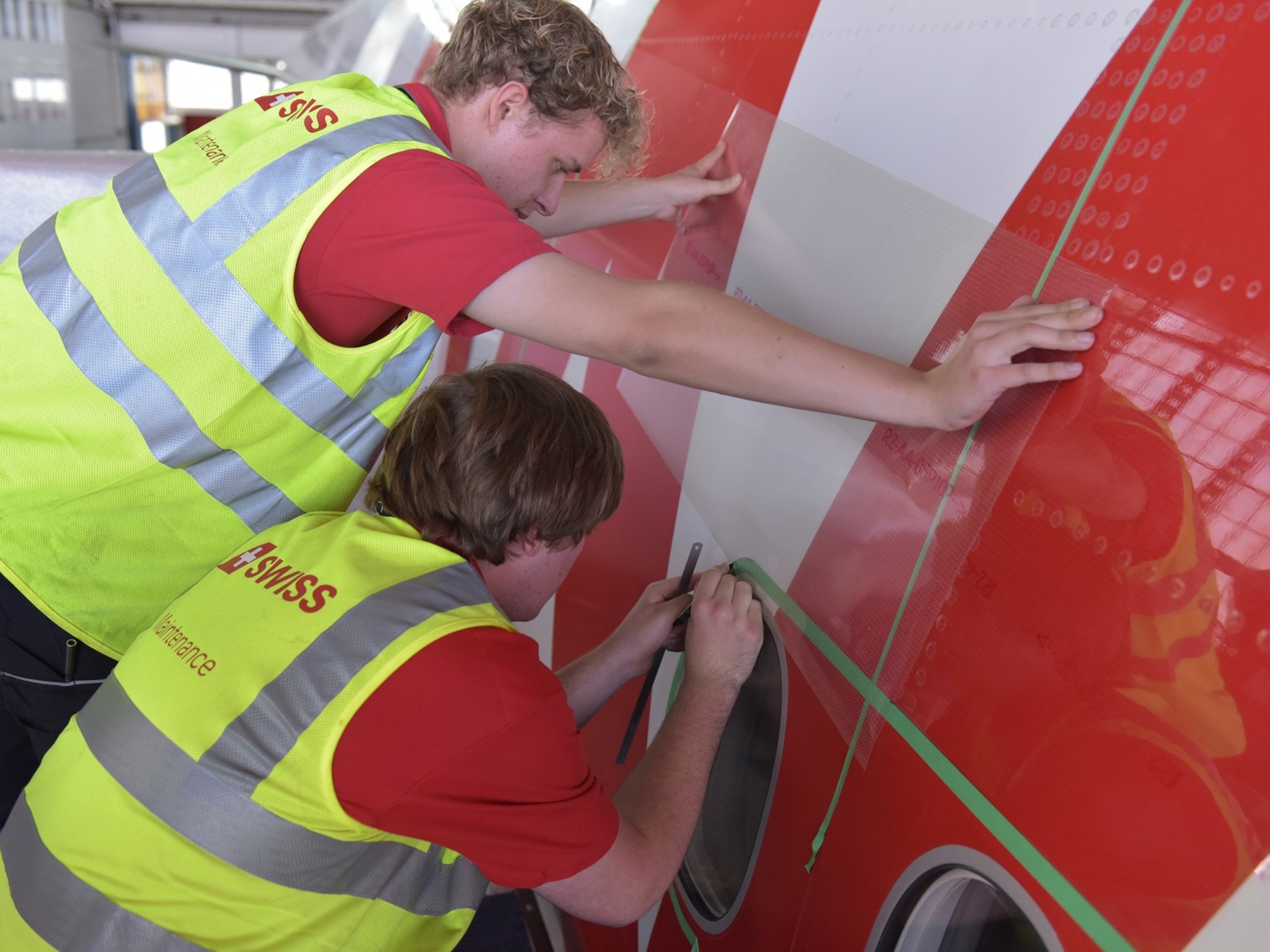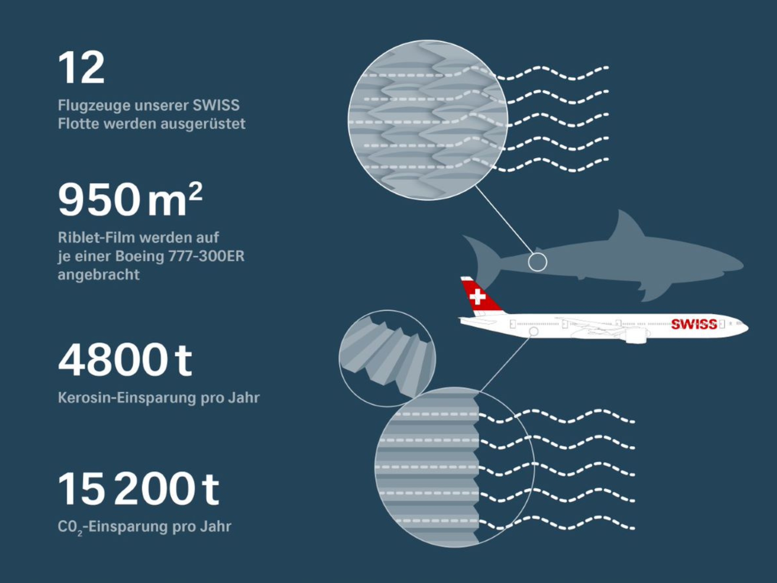 In der Werft 3 stellt die SWISS Maintenance die sogenannte AeroSHARK-Technologie vor, die sie seit 2020 als weltweit erste Airline auf Passagierflügen einsetzt. Eine durchsichtige, an Rumpf und Triebwerken befestigte Folie imitiert die strömungsgünstigen Eigenschaften der Haut des Haifisches und reduziert während dem Flug den Treibstoffverbrauch und CO2-Ausstoss.