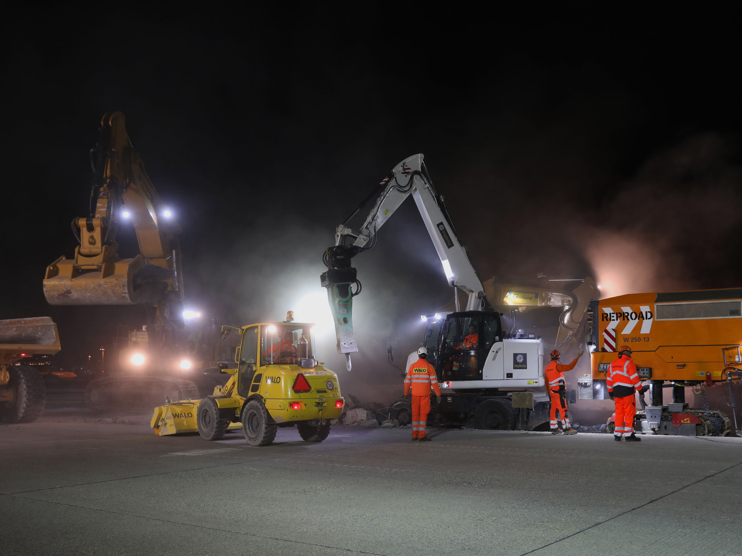 Mit eigens angefertigten Spezial-Baggerlöffeln werden die Betonplatten möglichst an einem Stück herausgebrochen und verladen.