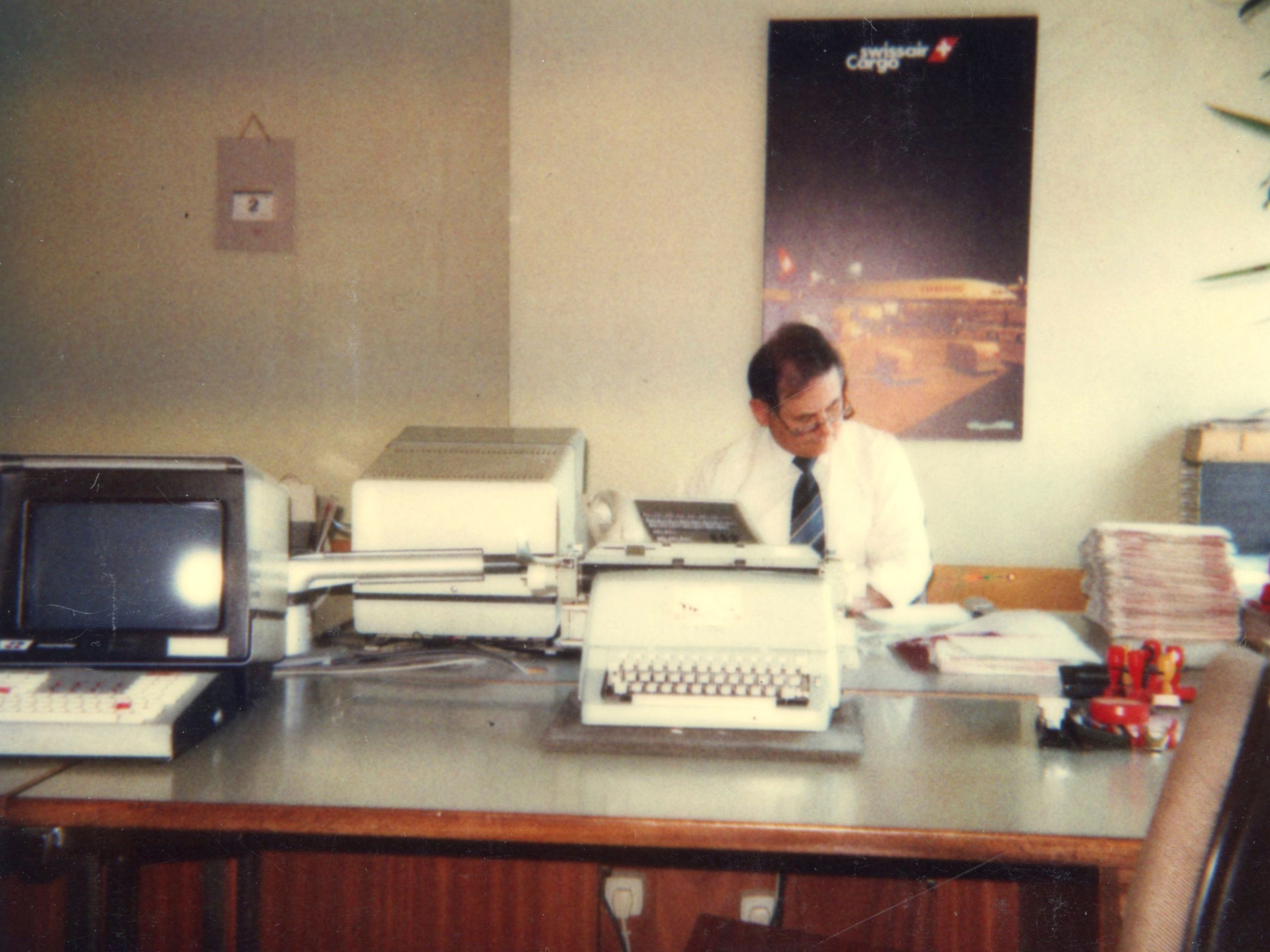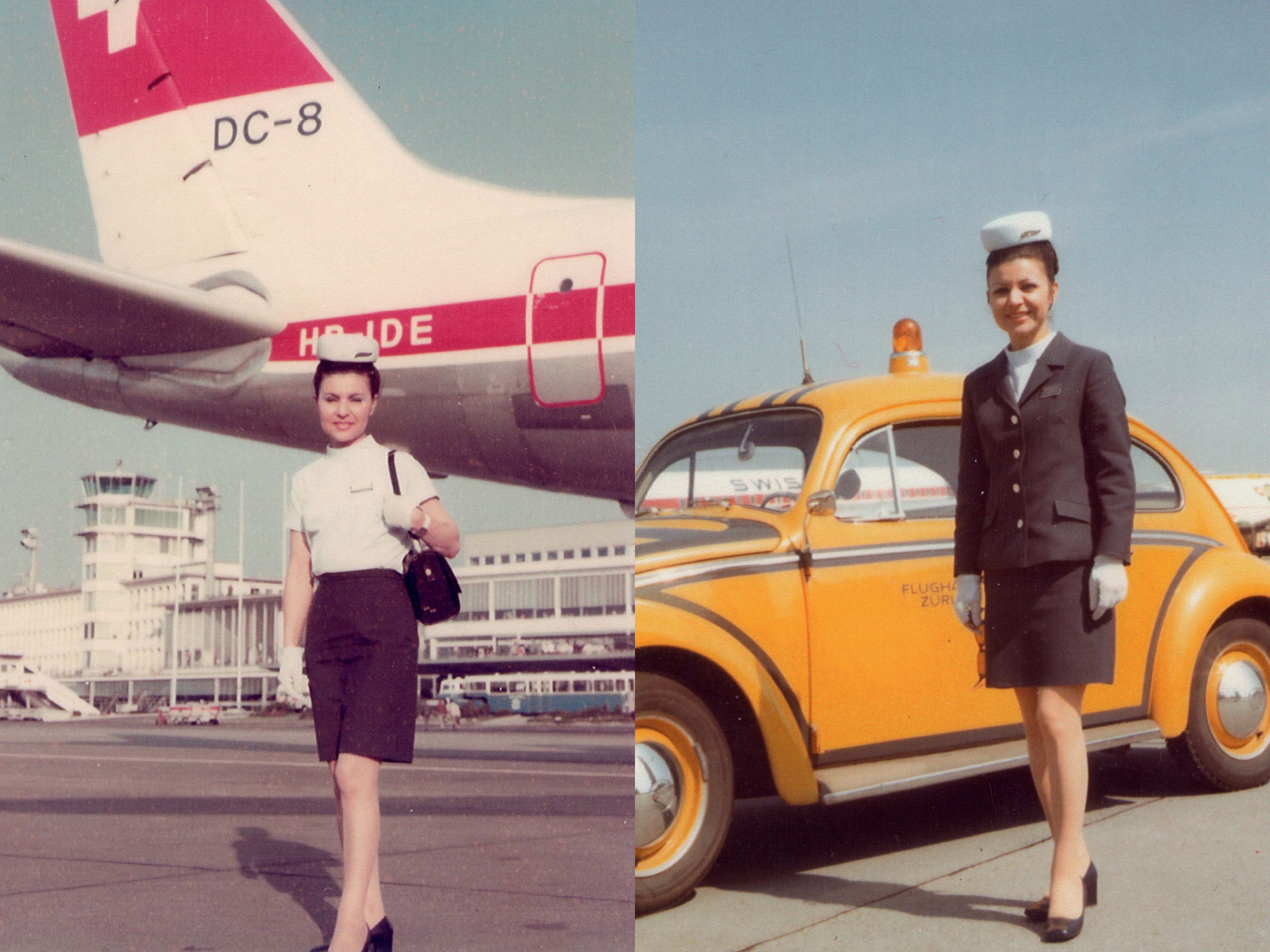 Mary Michalopoulos vor einer Douglas DC-8 der Swissair sowie dem historischen Tower in den 1960er-Jahren und vor einem Fahrzeug des damaligen Verkehrsdienstes, heute Airport Authority (Bild 1); Panos Michalopoulos in seinem Büro in der Fracht (Bild 2); Penelope in ihrer ersten Uniform in der Abteilung Masterplanung (Bild 3).