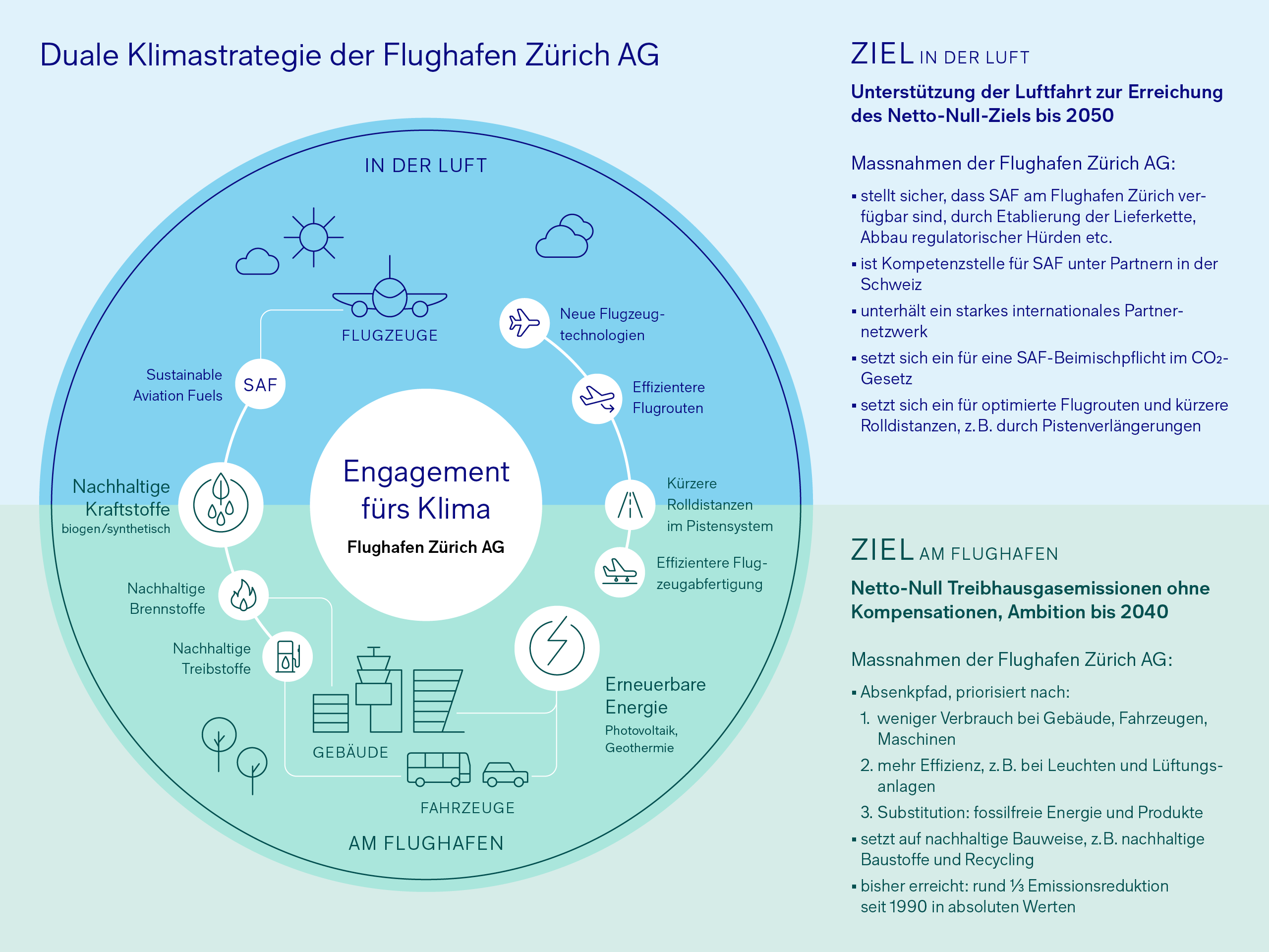 Für den weitaus grössten Teil der Treibhausgas-Emissionen in der Luftfahrt ist der Flugbetrieb verantwortlich. Der grösste Hebel liegt daher in der Luft mittels nachhaltigen Flugtreibstoffen, die kein CO2 aus fossilen Quellen ausstossen. Der Einsatz der sogenannten Sustainable Aviation Fuels (SAF) ist der vielversprechendste Ansatz zur Reduktion der Klimawirkung des Luftverkehrs. Die Flughafen Zürich AG unterstützt die Einführung von SAF in der Schweiz. Einerseits politisch durch die Beimischquote wie sie aktuell im revidierten CO2-Gesetz vorgeschlagen wird. Andererseits bringt sie als Plattform die wichtigsten Akteure zusammen, um die Verwendung in der Schweiz voranzutreiben. Dazu gehört die Etablierung der notwendigen Prozesse hinsichtlich Zoll und Import.