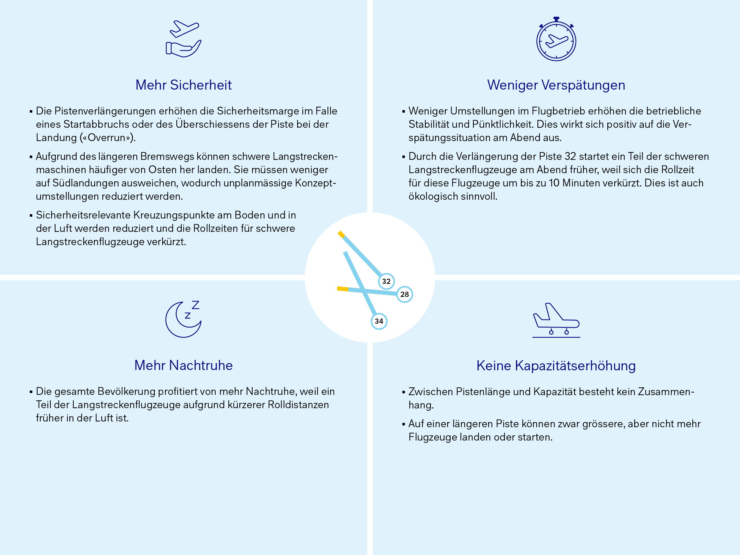 Fakt ist: Durch die Pistenverlängerungen können die heute bestehenden Instabilitäten im Ostkonzept vermindert werden. Mit einem kreuzungsfreieren Betrieb und kürzeren Rollzeiten für schwere Langstreckenflugzeuge wird die Pünktlichkeit im Ostkonzept verbessert und die Verspätungen am Abend dadurch reduziert. Dies wirkt sich positiv auf die Lärmsituation aus. Die Pistenverlängerungen verhelfen zu einer konsequenteren Abwicklung des Flugbetriebs, wie es politisch vorgegeben ist: Südkonzept am frühen Morgen, Nordkonzept den Tag hindurch und Ostkonzept am Abend. Dichtbesiedelte Gebiete im Süden werden damit am Abend weniger überflogen.