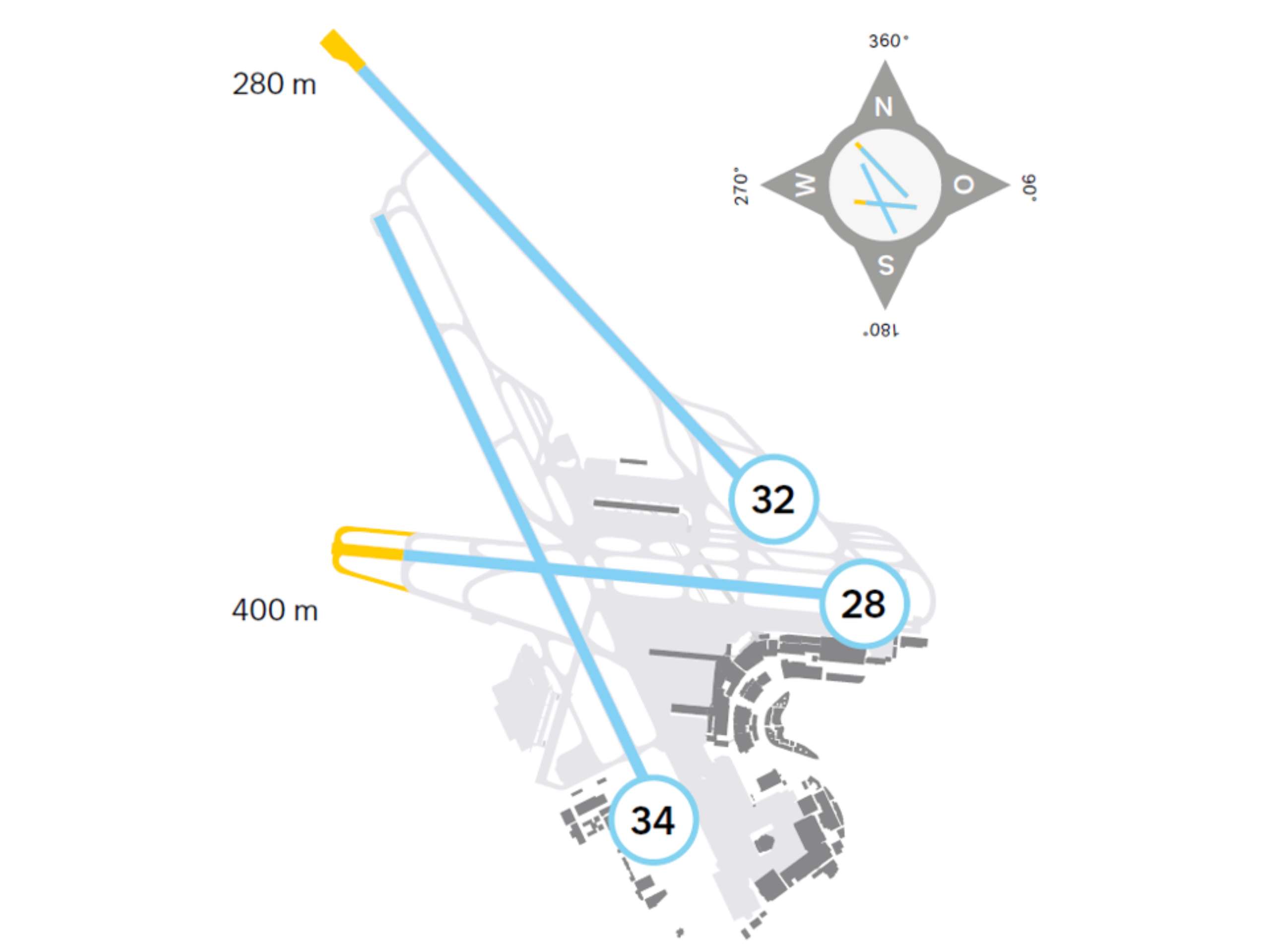 - Dank der verlängerten Piste kann am Abend auch bei anspruchsvolleren Wetterbedingungen auf Piste 28 gelandet werden. Die wetterbedingte Verfügbarkeit des Ostkonzepts wird erhöht.