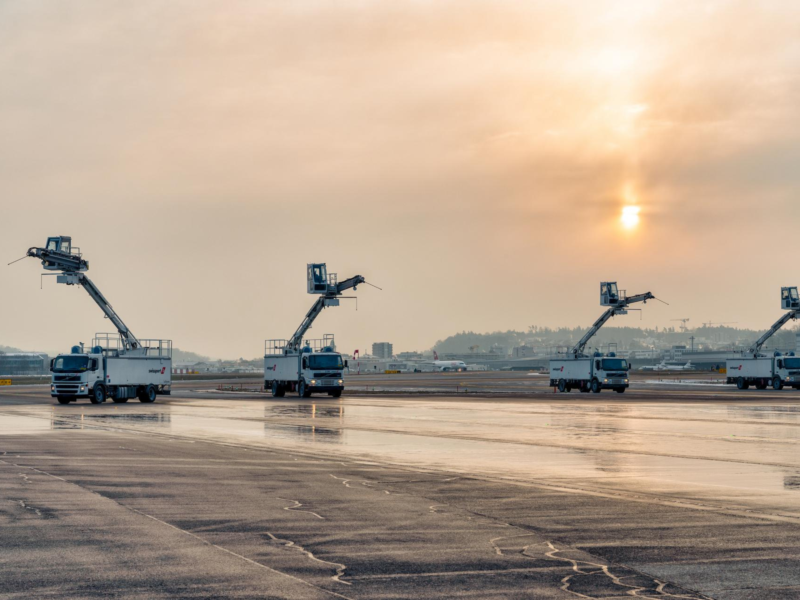 Am Flughafen Zürich werden rund 80 % der Enteisungen durch Swissport durchgeführt. Deren Pikett-Fahrer:innen sind mit bis zu zwölf Deicing Trucks im Einsatz, um die Flugzeuge von Schnee und Eis zu befreien. Je nach Flugzeugtyp und Wettersituation dauert der Enteisungsprozess auf dem Deicing-Pad zwischen drei und vier Minuten bei Frost respektive 20 bis 30 Minuten, wenn das Flugzeug zusätzlich von Schnee befreit werden muss. In der Wintersaison 2022/23 wurden knapp 3‘300 Deicings durchgeführt.
