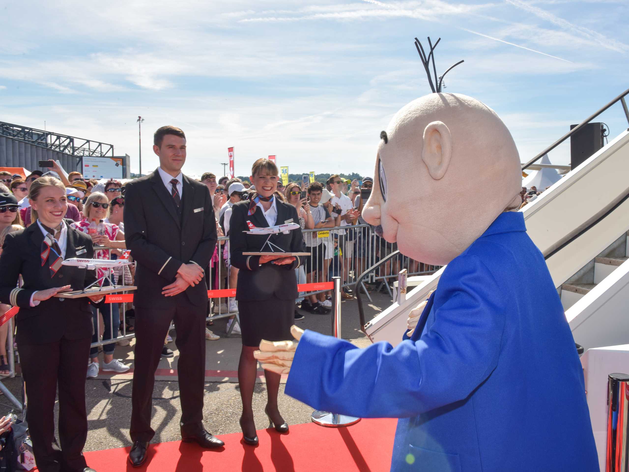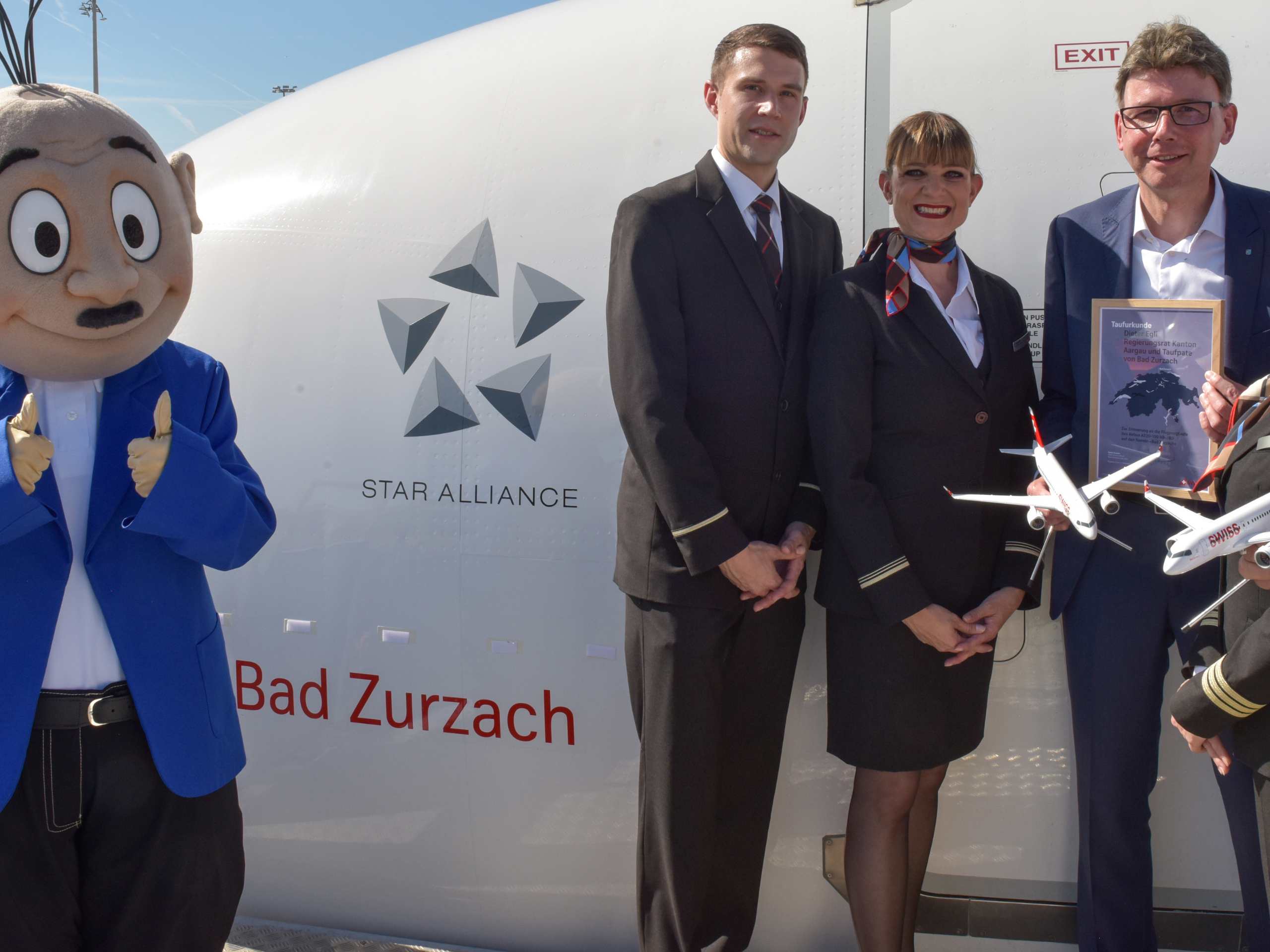 Auch am Flughafenfest zur Feier des 75-jährigen Bestehens des Flughafens Zürich anfangs September 2023 wurden zwei Flugzeuge unter grosser Begeisterung des Publikums getauft. An den drei Festtagen besuchten insgesamt rund 140'000 Gäste den Flughafen. Kein Wunder, fielen auch die Taufen etwas grösser aus. Bei der Taufe des Airbus’ A320 der Edelweiss auf den Namen «Villars-sur-Ollon» waren Bernd Bauer, CEO von Edelweiss, und Caroline Ganz de Meyer, Gemeinderätin von Ollon nebst zahlreichen Vertreterinnen und Vertretern aus Politik, Tourismus und Sport aus der Region vor Ort. Musikalisch wurde der feierliche Akt umrahmt vom Alphorn-Duo «Cors des Alpes». Die SWISS taufte einen Airbus A220 auf den Namen «Bad Zurzach» - ebenfalls mit prominenten Gästen vor Ort. Präsent waren unter anderem der Aargauer Regierungsrat Dieter Egli und Papa Moll, die Kultfigur aus Bad Zurzach.