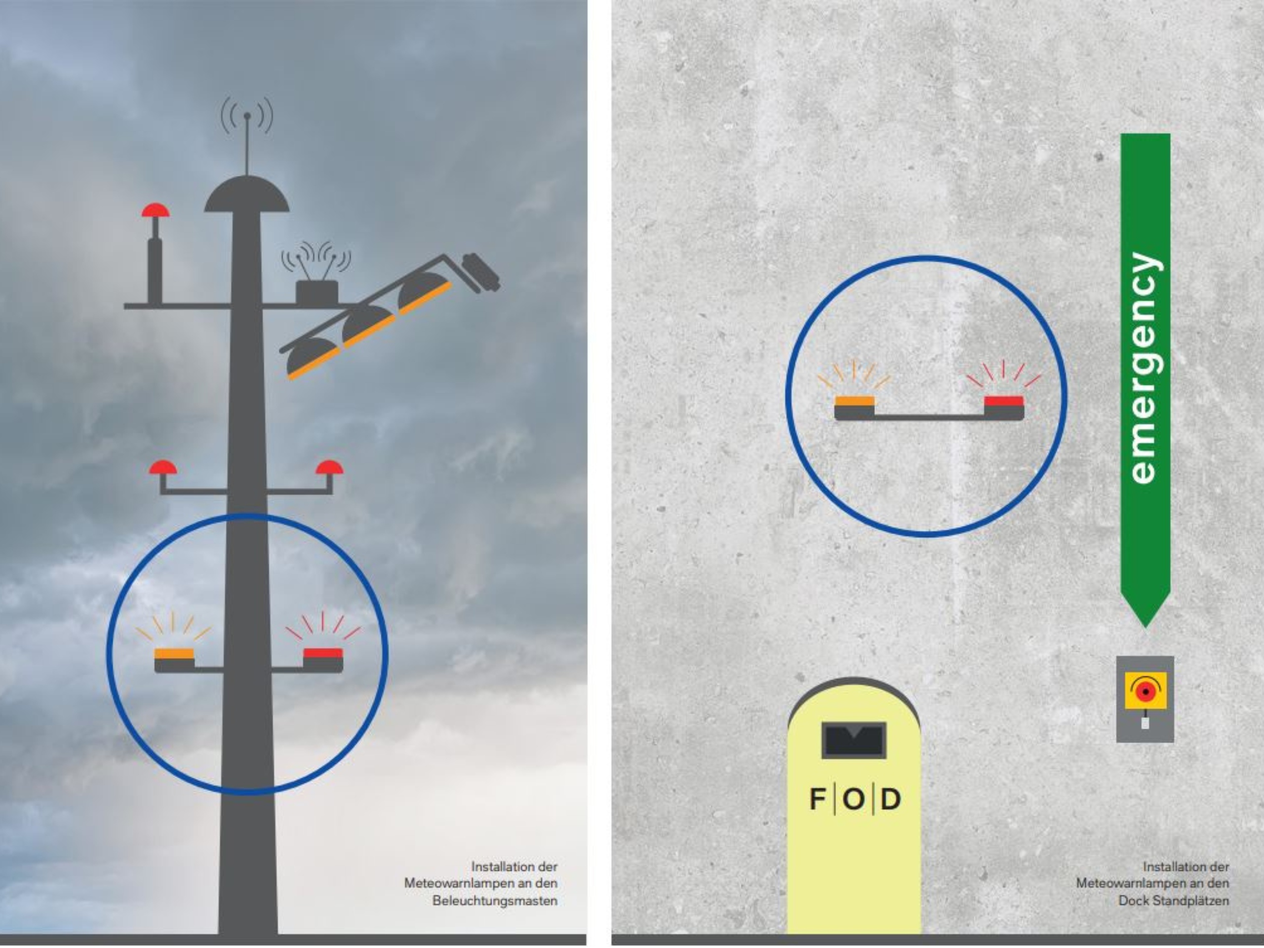 MeteoSchweiz überwacht das Wetter rund um die Uhr und die Flugwettermeteorologin oder der Flugwettermeteorologe ist im ständigen Austausch mit dem Tower und der Airport Authority. Kommt eine Gewitterzelle auf den Flughafen zu, informiert MeteoSchweiz so schnell wie möglich. Auch wenn sich ein Schauer bildet, der noch nicht blitzt, aber das Potenzial hat, sich zu verstärken, wird bereits telefonisch vorgewarnt. Nun gilt es, diese Informationen so schnell wie möglich weiterzugeben - nicht nur an die eigenen Mitarbeitenden, sondern auch an die verschiedenen Partnerfirmen, die am Flughafen Zürich tätig sind. Diese wiederum informieren ihre Mitarbeitenden auf dem Vorfeld. Der „Alarmstern“, das Alarmierungssystem des Flughafens, stellt die Kommunikation zwischen allen Beteiligten sicher. An den Alarmstern sind mehrere Empfänger wie Mobiltelefone und Handhelds angeschlossen. Zusätzlich leuchten auf dem gesamten Vorfeld Blitzwarnlampen. Diese blinken während der Warnung gelb, bei einem Handling Stopp rot. Auch auf Anzeigetafeln, an Toren und an Tankstellen werden die aktiven Alarme angezeigt.