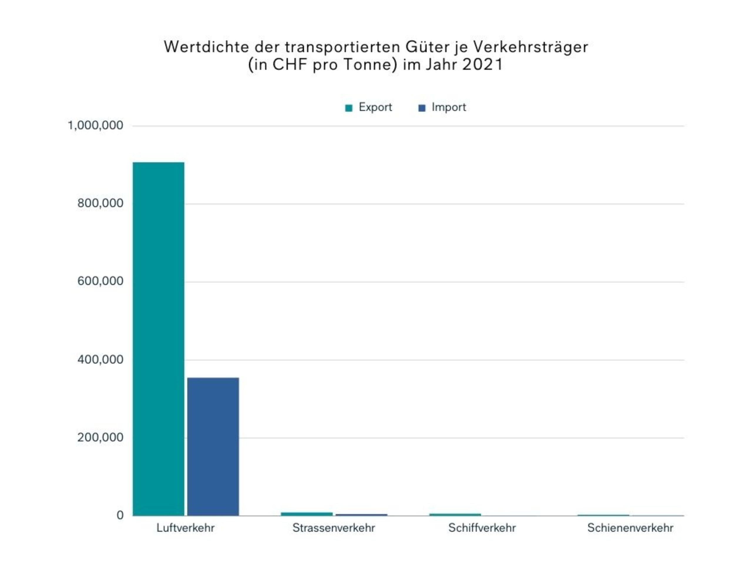 Der Warenwert für die Schweizer Luftfracht beträgt im Durchschnitt 1’413 Franken pro Kilo, im Vergleich zu knapp 9.50 Franken pro Kilo für den Landweg. Tatsächlich wird jeder zweite Franken, der aus der Schweiz exportiert wird, durch die Luftfracht verdient. Eine Tonne Luftfrachtexport ist im Durchschnitt über CHF 900‘000 wert. Dies entspricht rund dem Wert von 95 Tonnen Strassenexport, 150 Tonnen Schiffsexport oder 275 Tonnen Schienenexporten.