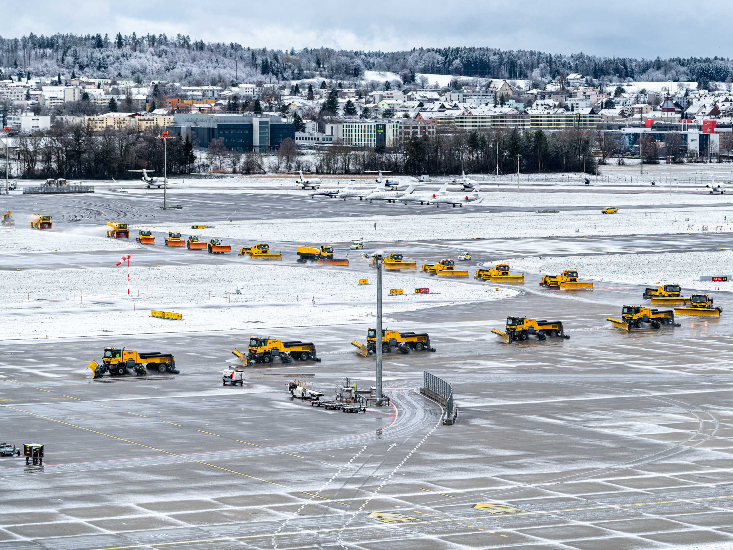 - Für den Winterdienst formiert sich eine eigene Organisation: Das Snow Committee gehört dem Airport Steering an und steuert zusammen mit den Deicing Koordinatoren alle Einsätze. Sie arbeiten eng mit Wetterdiensten wie Meteo Schweiz zusammen, um auf bevorstehende Schneefälle optimal vorbereitet zu sein.