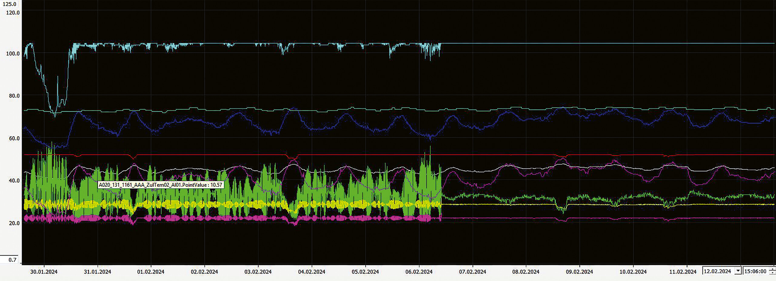 Ein Beispiel für schnelle Erfolge ist die optimale Einstellung von Lüftungsanlagen mit Wärmerückgewinnung. Dabei wird im Winter die Wärme der Abluft genutzt, um Frischluft vorzuwärmen. Sind Lüftung und Wärmerückgewinnung nicht gut abgestimmt, steigt der Energieverbrauch und der Verschleiss der Komponenten wie im Trendbild unten ersichtlich wird.