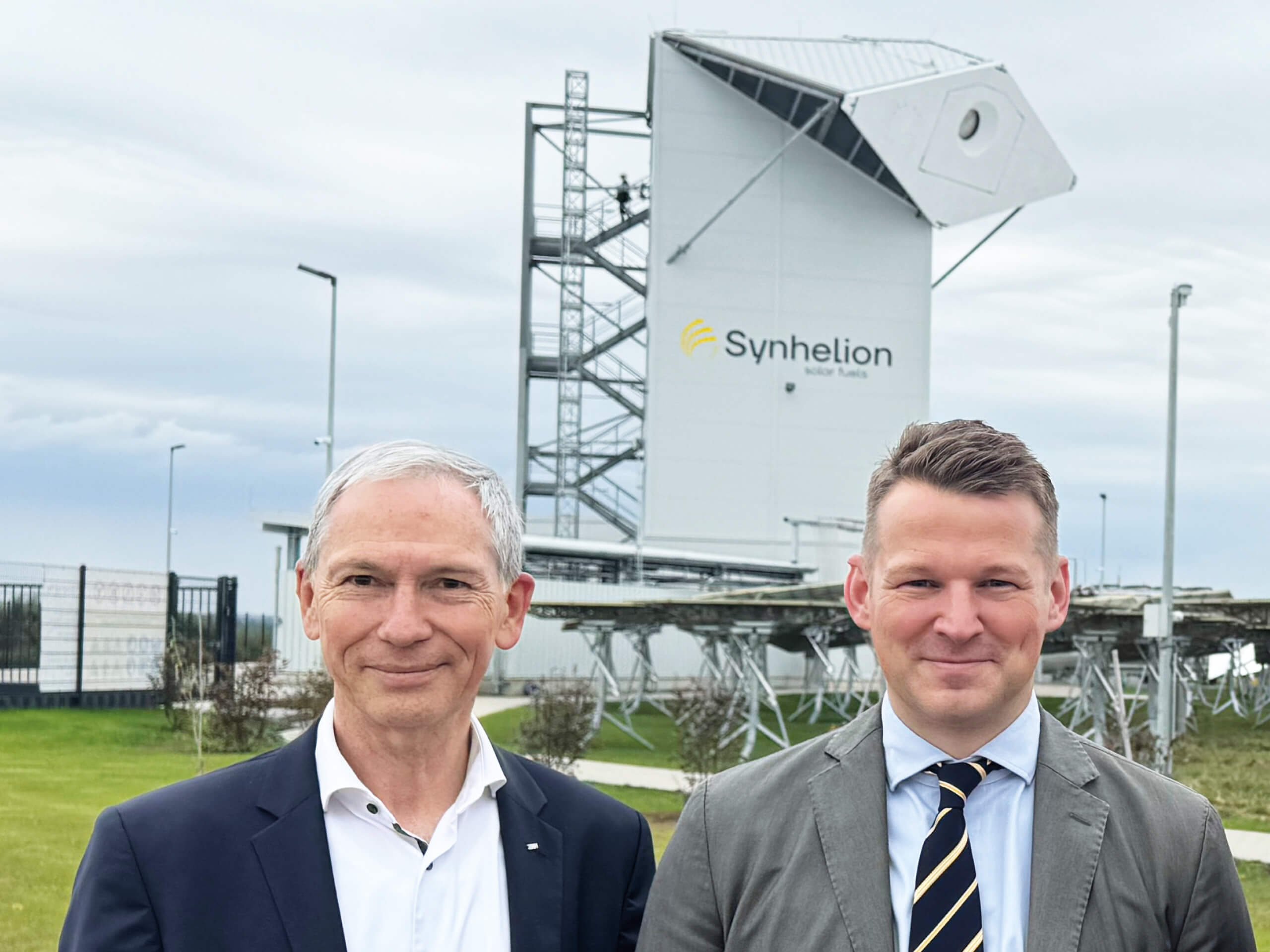 Seit 2020 unterhält die Flughafen Zürich AG eine Kooperationsvereinbarung mit Synhelion. Als Flughafen-Vertreter waren Kevin Fleck, CFO, und Emanuel Fleuti, Leiter Nachhaltigkeit und Umwelt zu Gast an der Einweihungsfeier der Produktionsanlage in Jülich. Sie konnten sich ein Bild vor Ort machen, wie die Technologie aussieht, mit der dereinst grössere Mengen an Solartreibstoff produziert werden. Beim Sun-to-Liquid-Prozess wird mittels Solarenergie Hochtemperatur-Prozesswärme von über 1’000 °C erzeugt, welche in einem thermochemischen Reaktor die Energie zur Erzeugung von Synthesegas, einem Gemisch aus H2 und CO, liefert. Das Synthesegas wird dann mit industriellen Verfahren in ein synthetisches Rohöl (Syncrude) verflüssigt, welches anschliessend in einer bestehenden Raffinerie zu zertifizierten Treibstoffen, z.B. Kerosin (Jet A1) oder Diesel, weiterverarbeitet und in die bestehenden Verteilnetze eingespeist wird. Als Ausgangsstoff für die Herstellung der Solartreibstoffe ist eine erneuerbare Kohlenstoffquelle nötig, die kein zusätzliches fossiles CO2 emittiert.