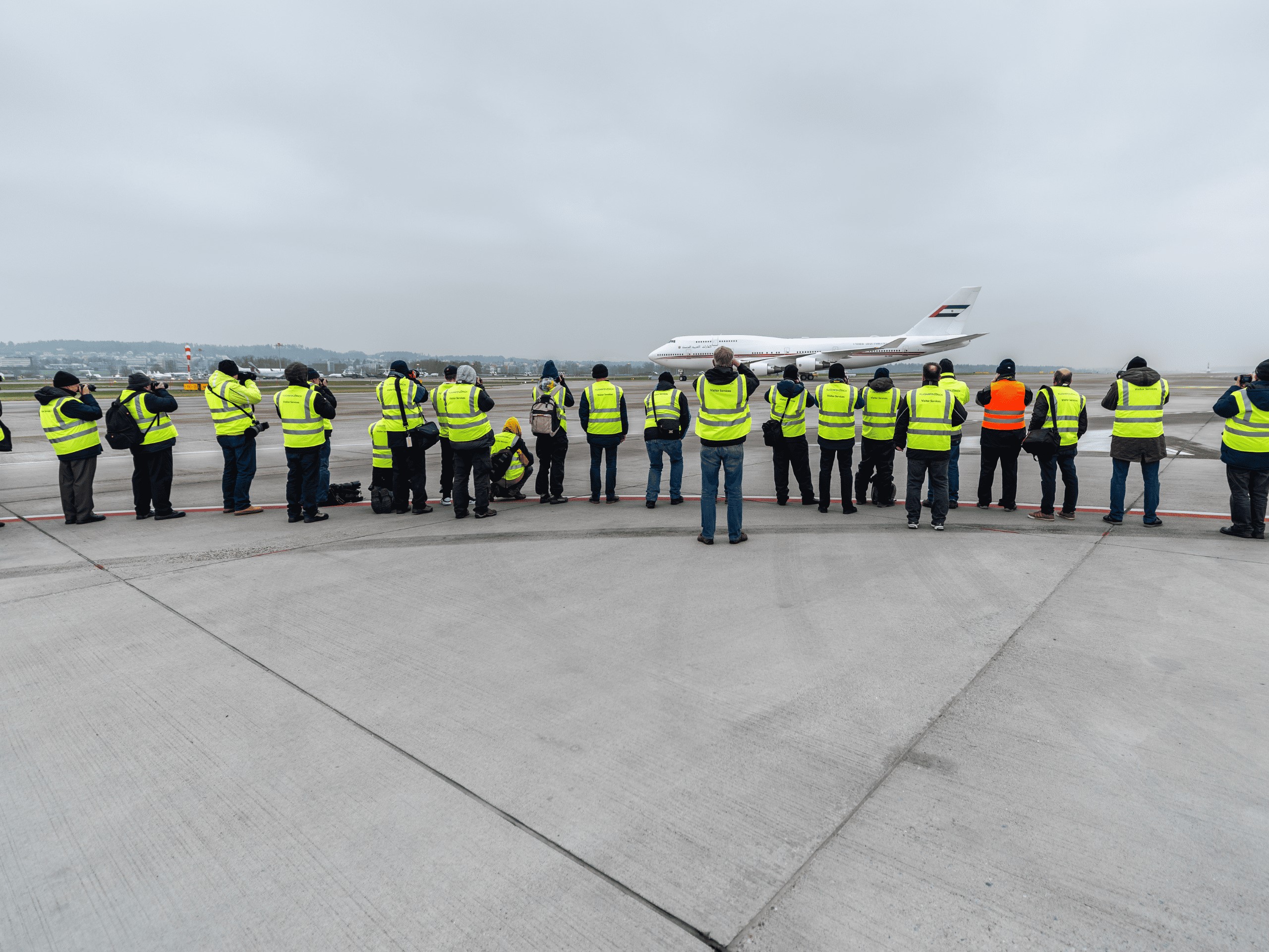 Auch Spotter und Aviatik-Fans kommen während der WEF-Woche auf ihre Kosten: Die Zuschauerterrasse B ist vom 18. bis 24. Januar täglich von 08:00 bis 20:00 Uhr geöffnet. Beliebte Standorte wie der Spotterplatz auf der Westseite des Flughafens oder der Spotterplatz in Oberglatt bieten spannende Einblicke ins Geschehen oder zumindest einen Blick auf besondere Flugzeugtypen, Bemalungen und Heckflossen. Zusätzlich werden spezielle Rundfahrten auf dem Flughafenareal angeboten, bei denen die Flugzeuge so nahe wie möglich fotografiert werden können. Dabei werden aber nur Standplätze von Flugzeugen besucht, bei denen die Delegation schon ausgestiegen und abgefahren ist.