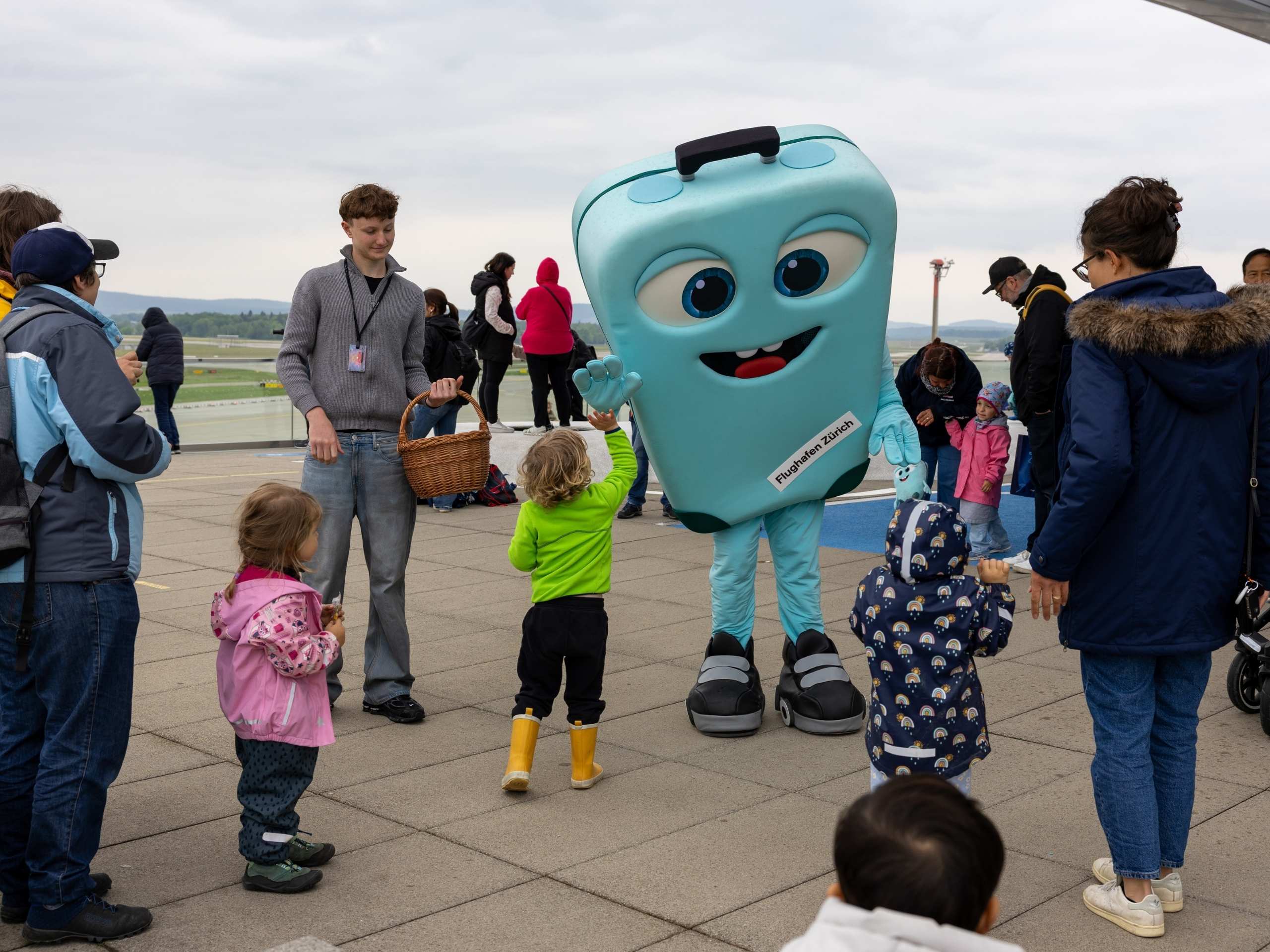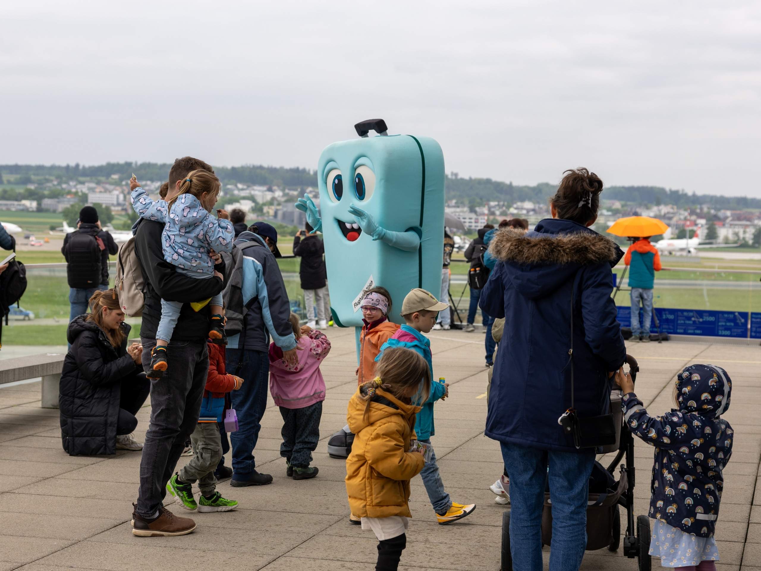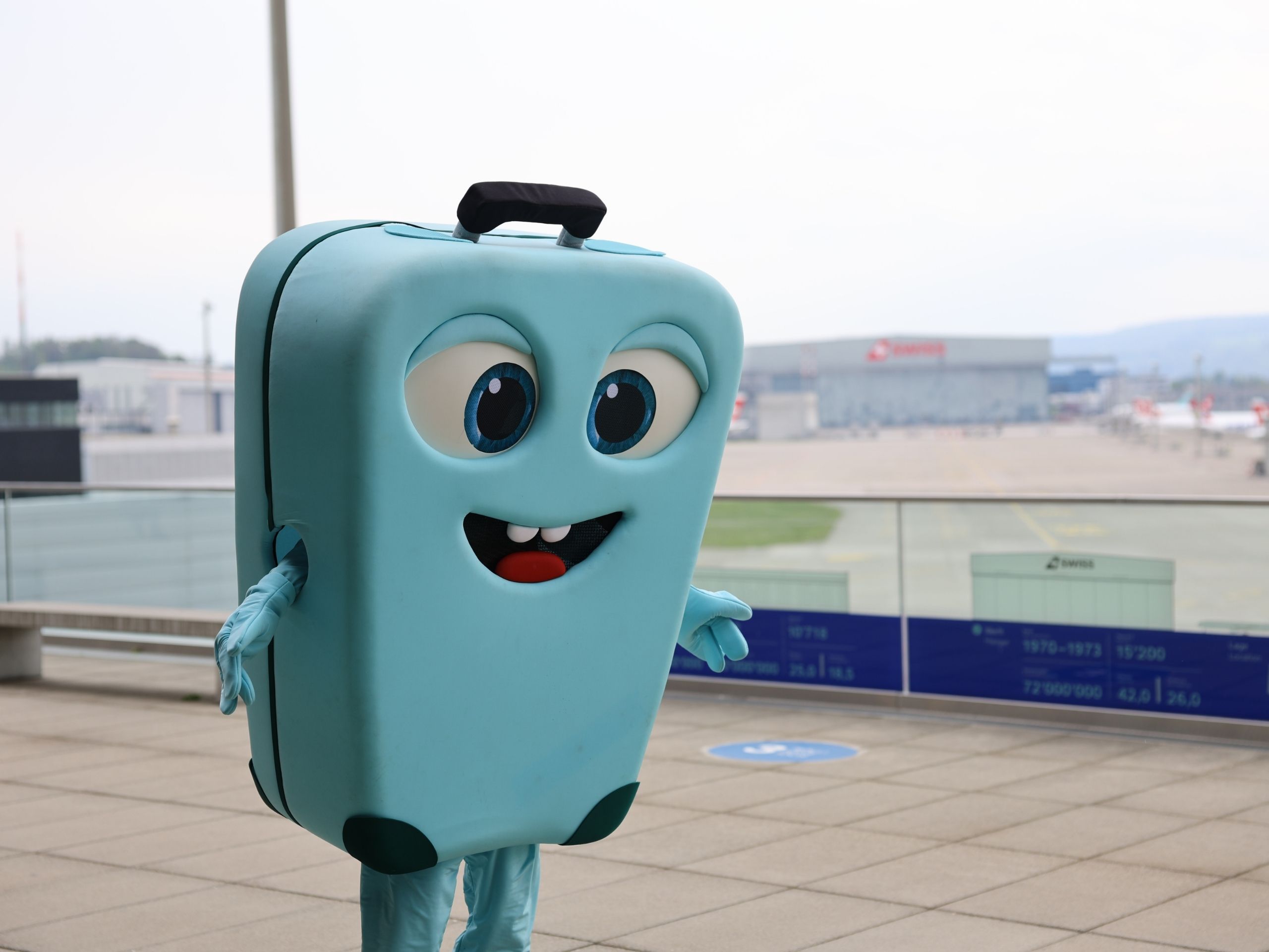 Die Idee für ein eigenes Maskottchen entstand im Zuge des Rebrandings der Flughafen Zürich AG im Jahr 2019. Ziel war es, der Marke «Flughafen Zürich» ein sympathisches Gesicht zu verleihen – eine Identifikationsfigur, die besonders bei Familien und Kindern in Erinnerung bleibe, und emotionale Nähe schaffe, sagt Julia Neubauer, Senior Manager Ausflugziel. Schnell kristallisierte sich ein Rollkoffer als Favorit heraus. Andere aviatische Sujets waren bereits von Flughafenpartnern besetzt oder passten vom Kontext her nicht zur Flughafenbetreiberin. Gleichzeitig bot der Rollkoffer eine ideale Grundlage, um Wissen spielerisch und spannend zu vermitteln: Was passiert mit einem Gepäckstück vom Check-in bis ins Flugzeug? Was darf auf die Reise mitgenommen werden? In einem mehrstufigen Prozess inklusive einer Umfrage unter den Mitarbeitenden und der Community auf Social Media wurde der Rollkoffer als Maskottchen geboren. Der Name «Rolli» setzte sich in der finalen Abstimmung durch und für die Farbe fiel die Wahl auf ein frisches Türkisblau, das sich schon nur optisch von den anderen, sich am Flughafen tummelnden Maskottchen abhebt. Doch dazu später mehr.Seinen ersten Auftritt hatte Rolli dann mitten im ersten Lockdown 2020. Nicht wie ursprünglich vorgesehen im Rahmen eines Events, sondern mit dem Rätselbuch «Kids Tour mit Rolli Rollkoffer» und Ausmalvorlagen, die Kinder im Rahmen der Aktion «Flughafen kommt zu Dir nach Hause» online herunterladen konnten. Mittlerweile gibt es von Rolli auch eine Plüschvariante, verschiedene Give-aways und auch auf den Spielplätzen des Flughafens ist er präsent.