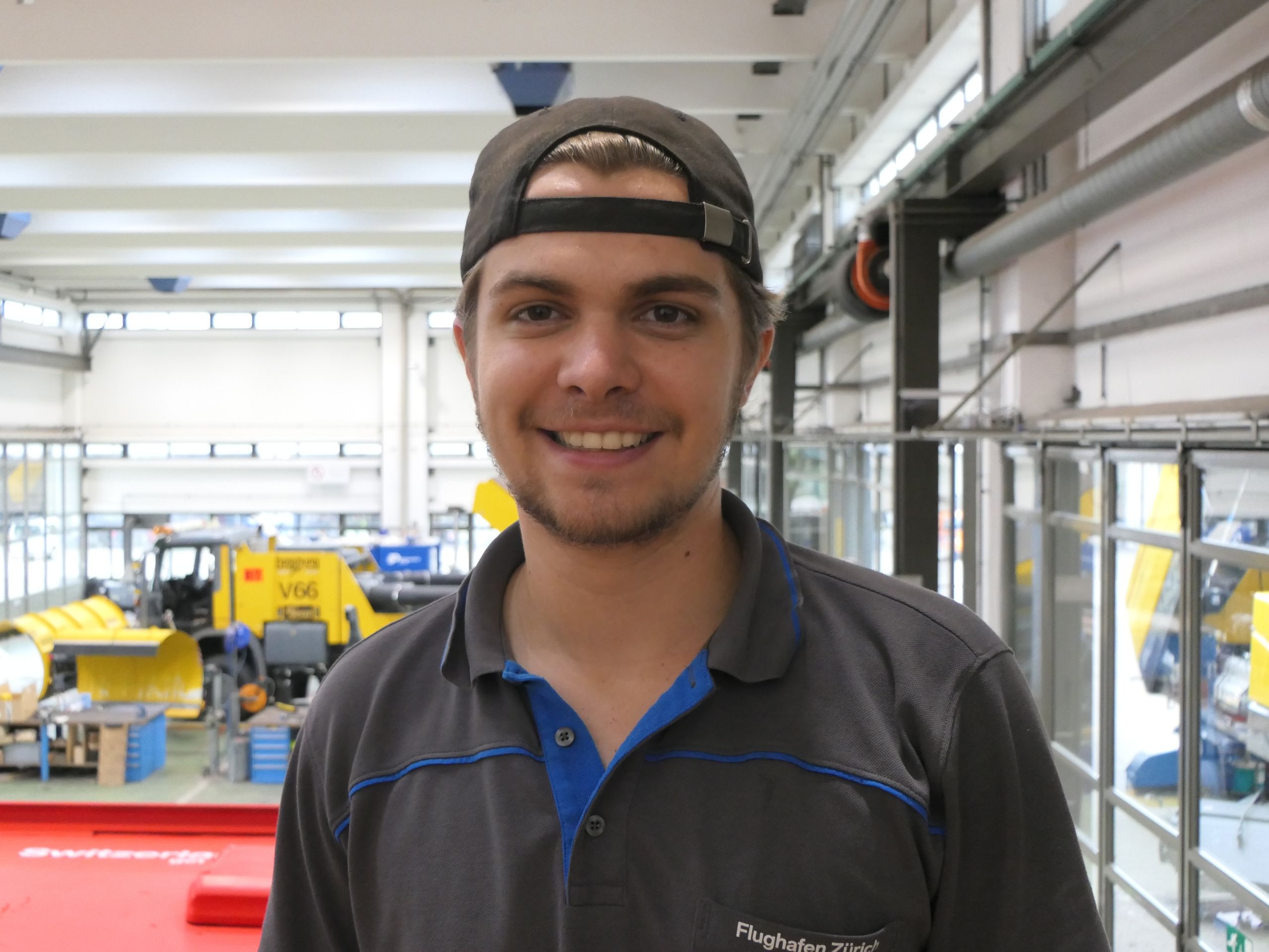 In der Fahrzeugwerkstatt im Werkhof herrscht stets ein geschäftiges Treiben. Maschinen surren, Werkzeuge klirren und Elias Wille, einer unserer angehenden Automobil-Mechatroniker EFZ im dritten Lehrjahr, widmet sich konzentriert den verschiedenen Fahrzeugen, die im emsigen Betriebsalltag am Flughafen Zürich im Einsatz sind. Unser Unternehmen bildet die Lernenden in der Fachrichtung Nutzfahrzeuge aus, doch sie schrauben im Alltag ebenfalls regelmässig an Personenwagen. So eröffnen sich ihnen nach dem Abschluss umfassendere berufliche Möglichkeiten und erweiterte Perspektiven, da sie als Generalist:innen nahezu jedes Problem an einem fahrbaren Untersatz beheben können. «Egal, ob nachhaltige Elektroautos, riesige Entsorgungsfahrzeuge oder flughafenspezifische Vehikel – die Aufgaben sind immer abwechslungsreich und es gibt keine zwei identische Problemstellung», schwärmt Elias. Nach seiner gymnasialen Maturität wollte er sein theoretisches Wissen praktisch anwenden. Deshalb begann er nach einem Praktikum in unserem Unternehme eine von regulären vier auf drei Jahre verkürzte Ausbildung. Dies ist möglich, da ihm einige allgemeinbildende Fächer aus der Matura angerechnet werden. Sein Fernziel ist ein Studium mit Spezialisierung auf Automobil- und Fahrzeugtechnik. Dazu wollte Elias zuerst den Blickwinkel des Ausführenden einnehmen, um später als Entwickler über ein besseres technisches Verständnis zu verfügen.