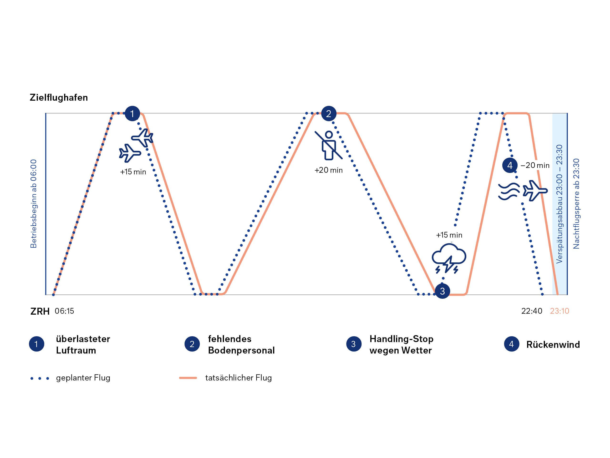 Fällt der Verspätungsabbau aufgrund einer Betriebszeitenkürzung weg, könnte beispielsweise ein verspätetes Flugzeug aus London abends nicht mehr in Zürich landen. Die Konsequenz: Der für den nächsten Morgen geplante Flug aus Zürich muss gestrichen werden, ebenso die weiteren mit dieser Maschine geplanten Verbindungen.