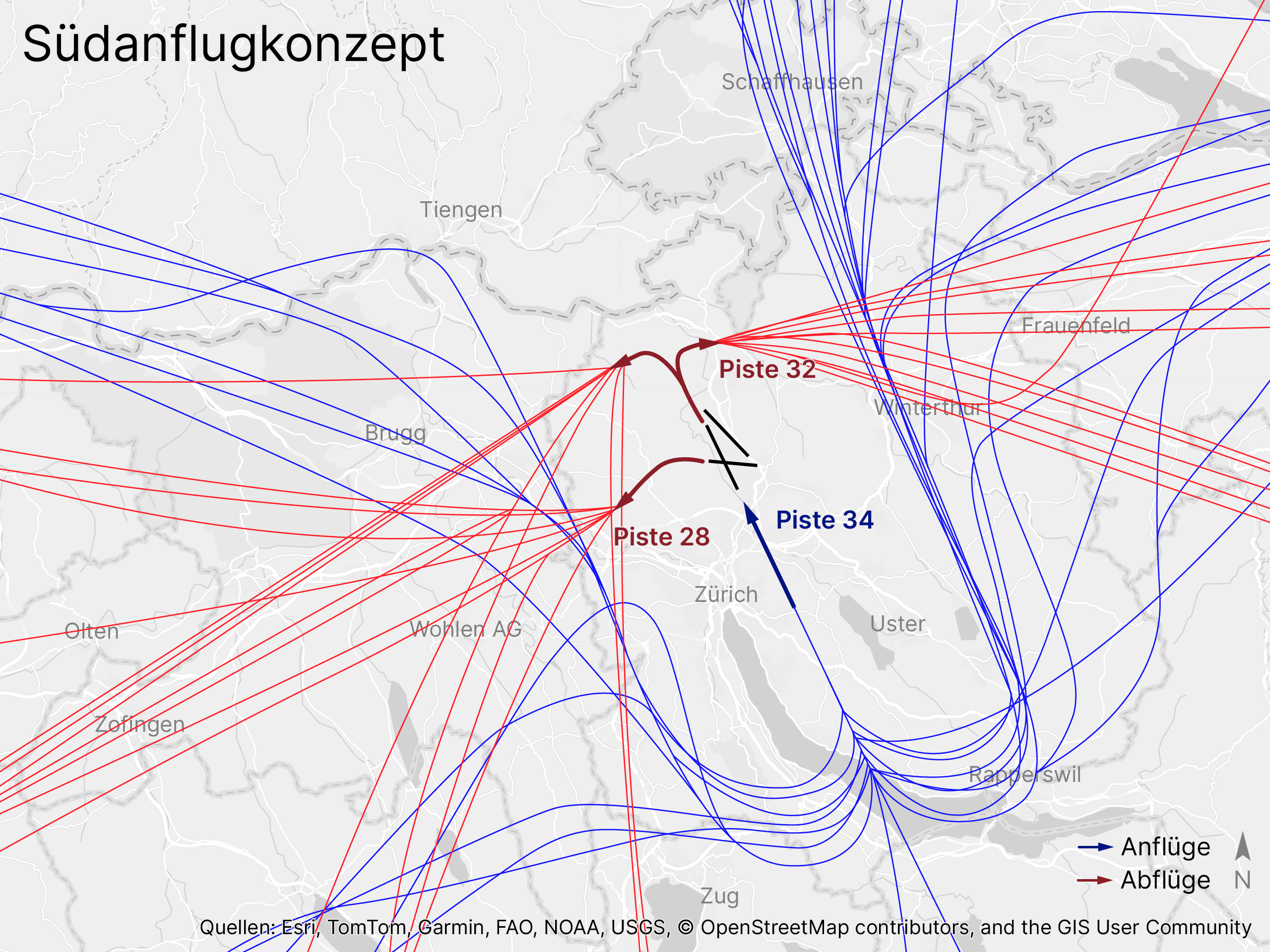 Morgens von 06:00 bis 07:00 Uhr von Montag bis Freitag sowie von 06:00 bis 09:00 Uhr an Wochenenden und an baden-württembergischen Feiertagen erfolgt der Anflug von Süden auf Piste 34 (Südanflugkonzept). Der Abflug erfolgt in Richtung Norden von den Pisten 34 und 32 oder in Richtung Westen von Piste 28. Wenn die Wettersituation keine Südanflüge zulässt, wird stattdessen von Osten angeflogen. Erst als letzte Option wird vor 07:00 Uhr bzw. 09:00 Uhr auf Anflüge aus dem Norden umgestellt.