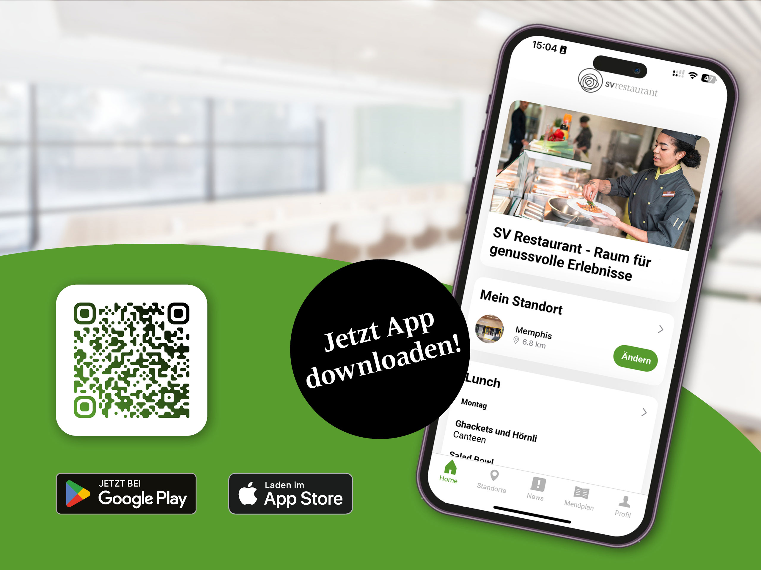 Du willst auf dem Laufenden bleiben? Dann lade die SV App auf dein Smartphone und erkunde einfach und smart den Menüplan. Nutze den Filter, wenn du Allergien oder andere Ernährungsbedürfnisse hast, um das passende Menü für dich zu finden. Ein weiterer Vorteil ist, dass du laufend über Erlebniswochen, Gewinnspiele und aktuelle Produkte informiert wirst.