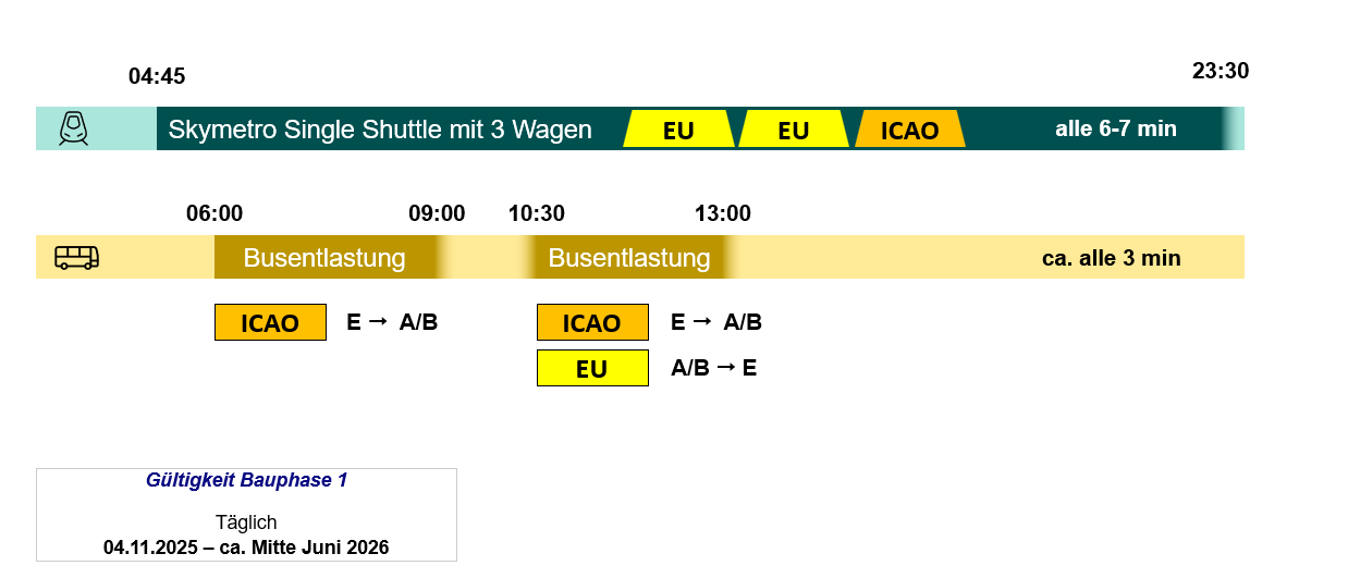 Diese Zeiten können je nach Bedarf – z.B. während hohem Passagieraufkommen in der Weihnachtsreisezeit – angepasst werden.