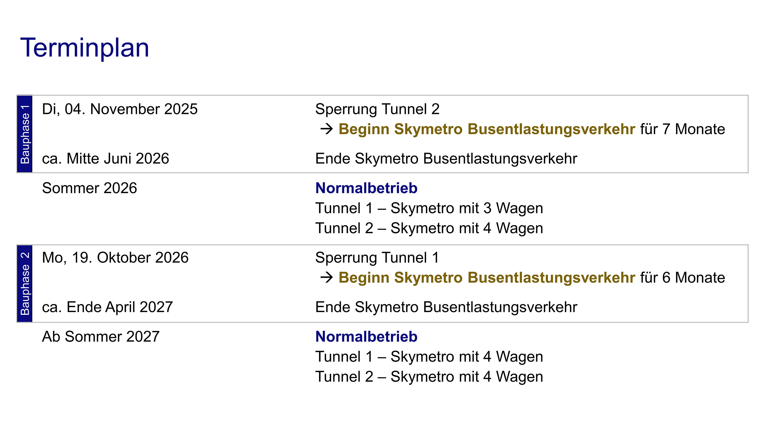 Die Bauarbeiten machen etappenweise Tunnelsperrungen notwendig. Während der Bauphasen wird ein Busersatz eingesetzt. Dieser verkehrt zu folgenden Zeiten: