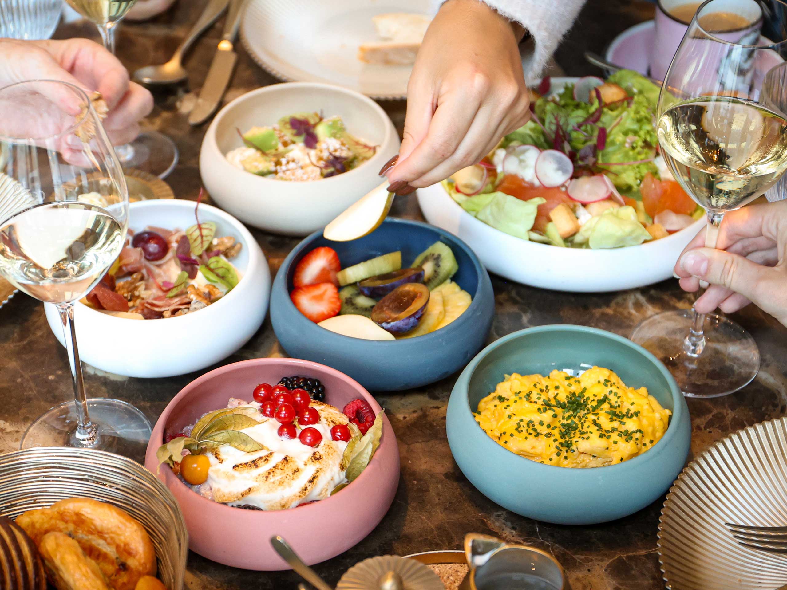 Freu dich auf knusprige Brotsorten, feines Gebäck sowie ausgewählte Käse- und Charcuteriespezialitäten. Dazu werden unter anderem frische Austern, Lachs mit Meerrettich, Crevettencocktail, Rindstatar und aromatischer Couscous serviert.