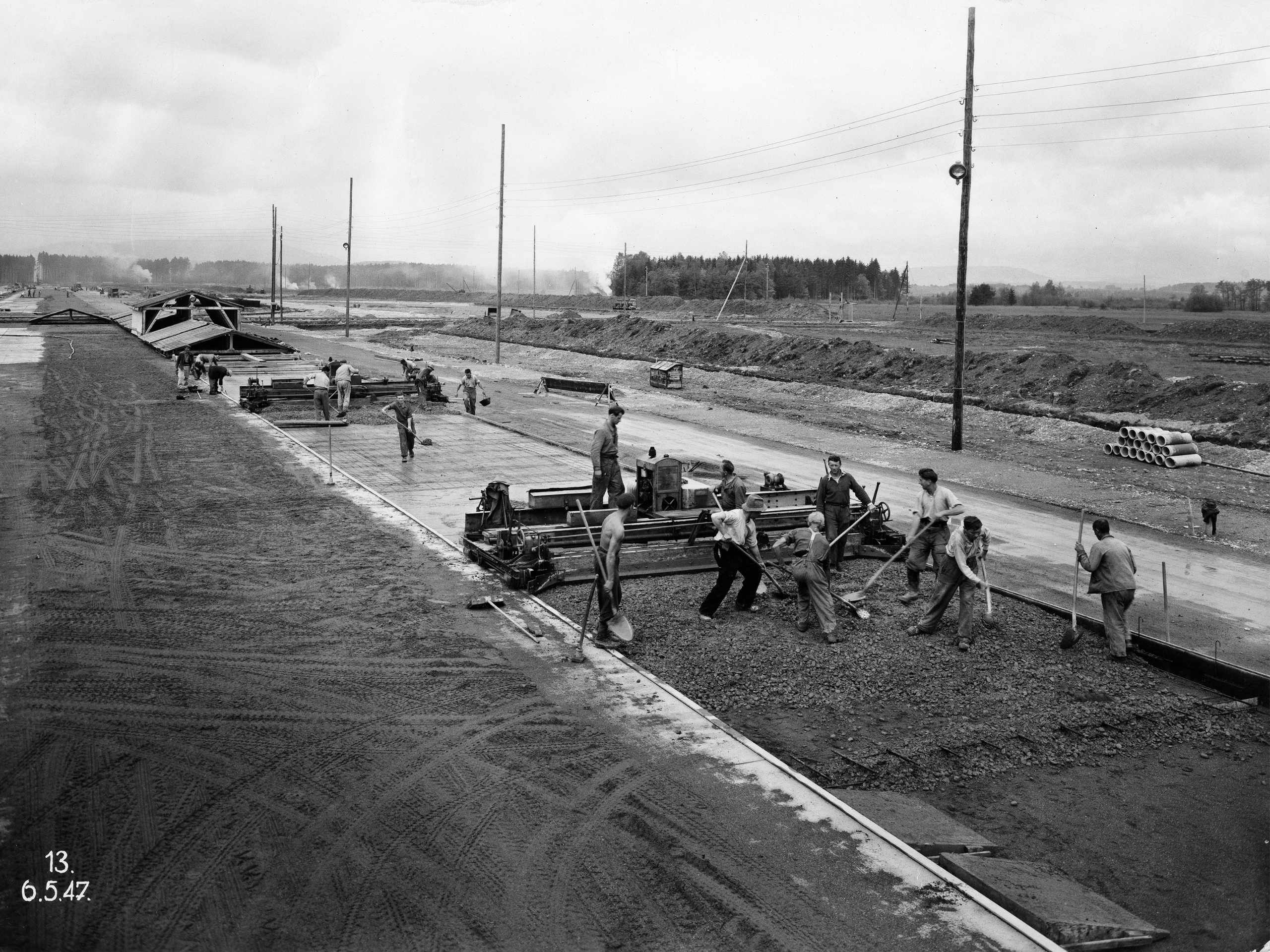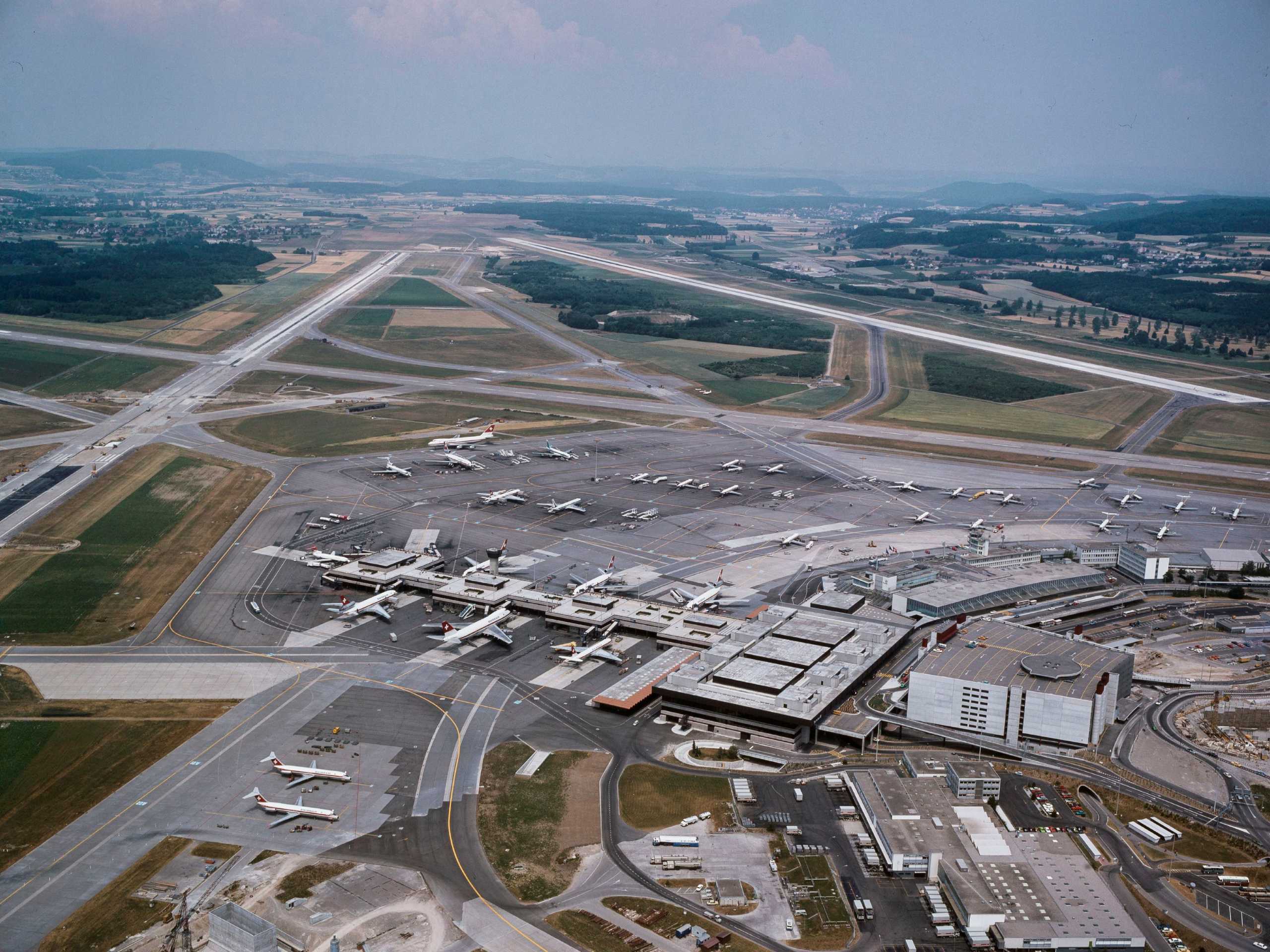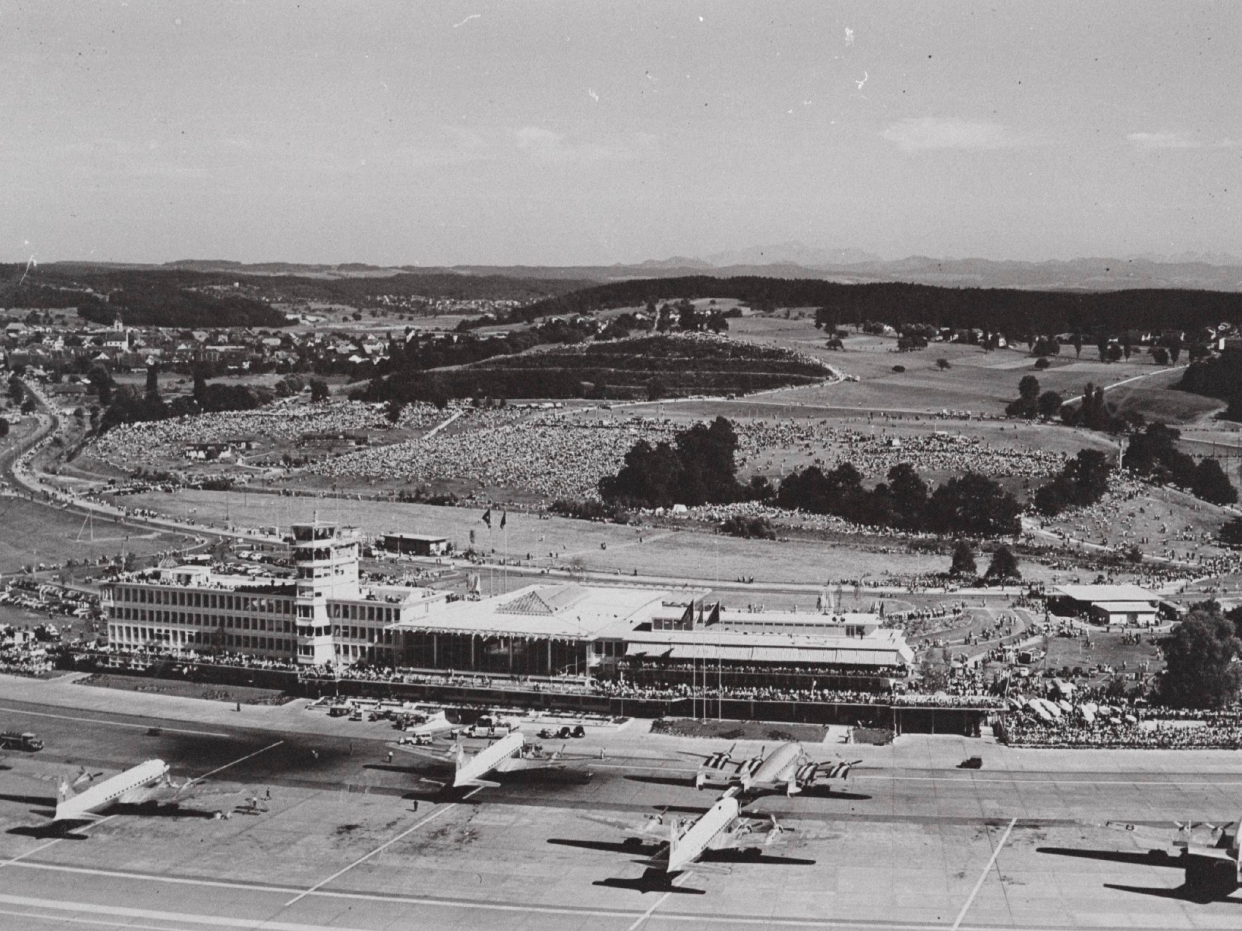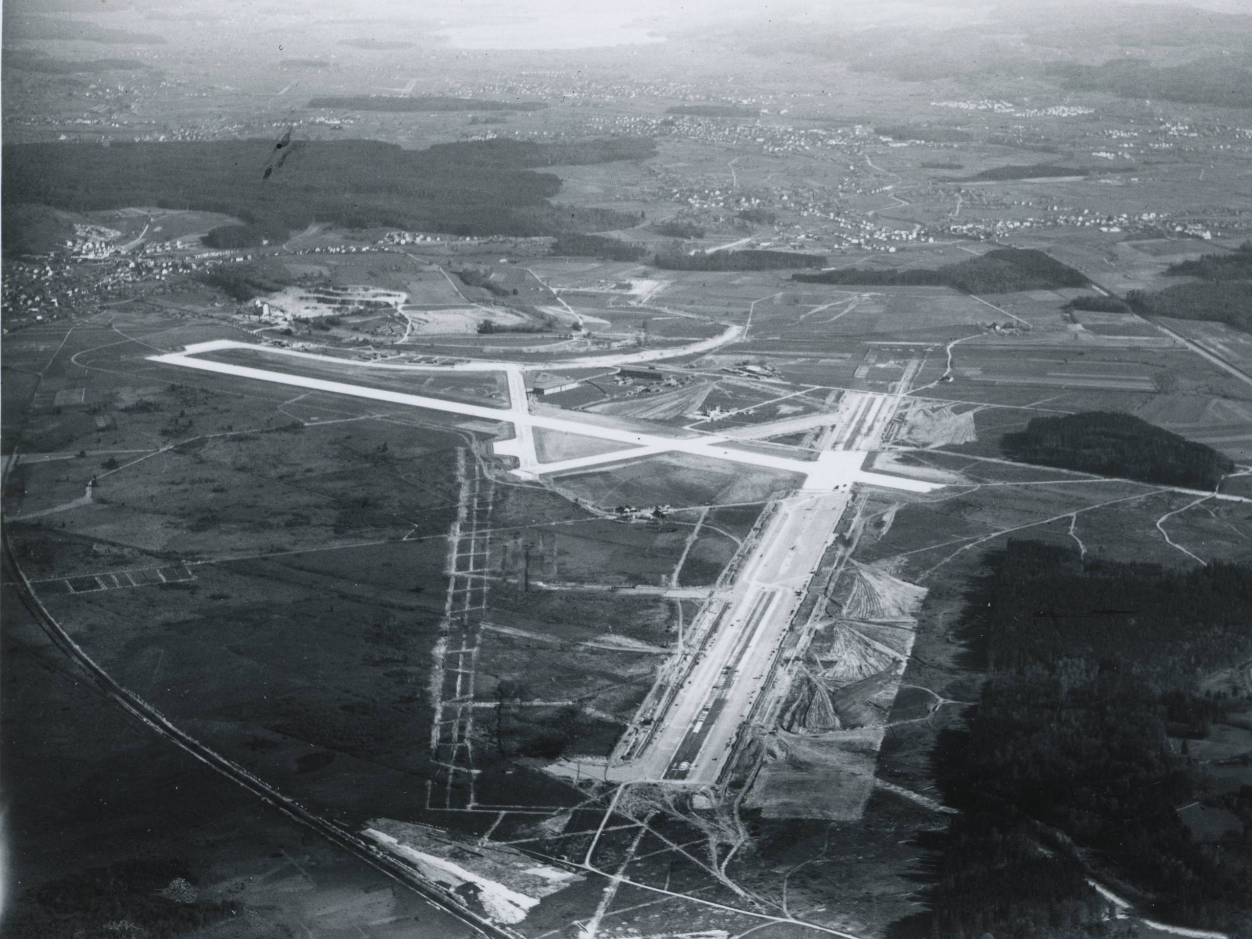 In just two years, Switzerland's largest airport is built on the swampy wasteland that was once the artillery training ground. Taking the wind direction into account, a runway is built from east to west, with a second crossing it from north to south for blind landings.