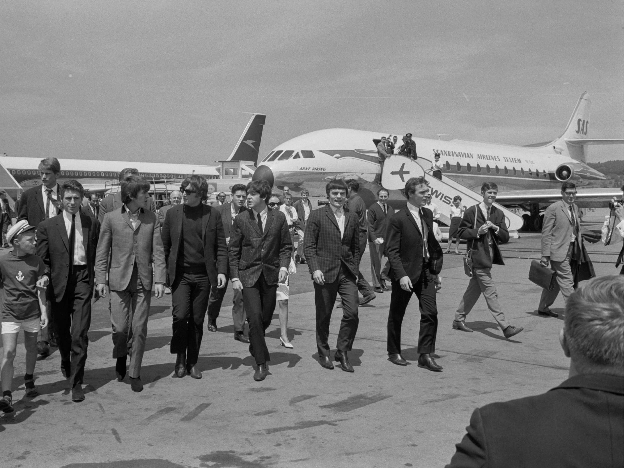 The Beatles stop over at Zurich to promote their new film. Global stars John Lennon, Paul McCartney, George Harrison and Jimmie Nicol are greeted with exuberant cheers as they pass through the transit area.