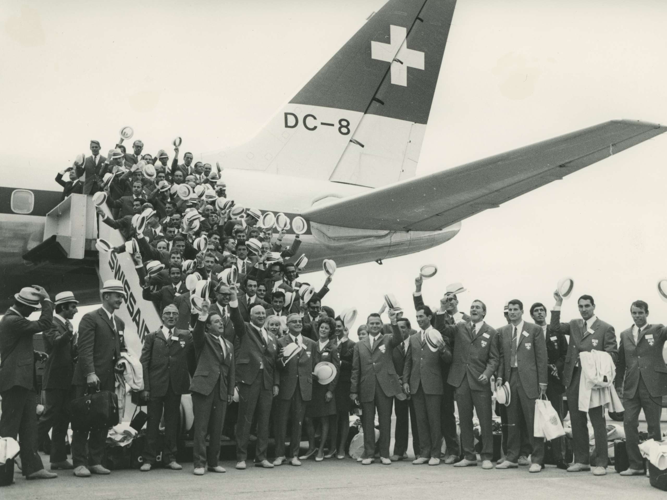 A large group of Swiss athletes gather at the airport to travel to the Summer Olympics in Mexico City. Bernard Dunand, Louis Noverraz and Marcel Stern win a silver medal in sailing.