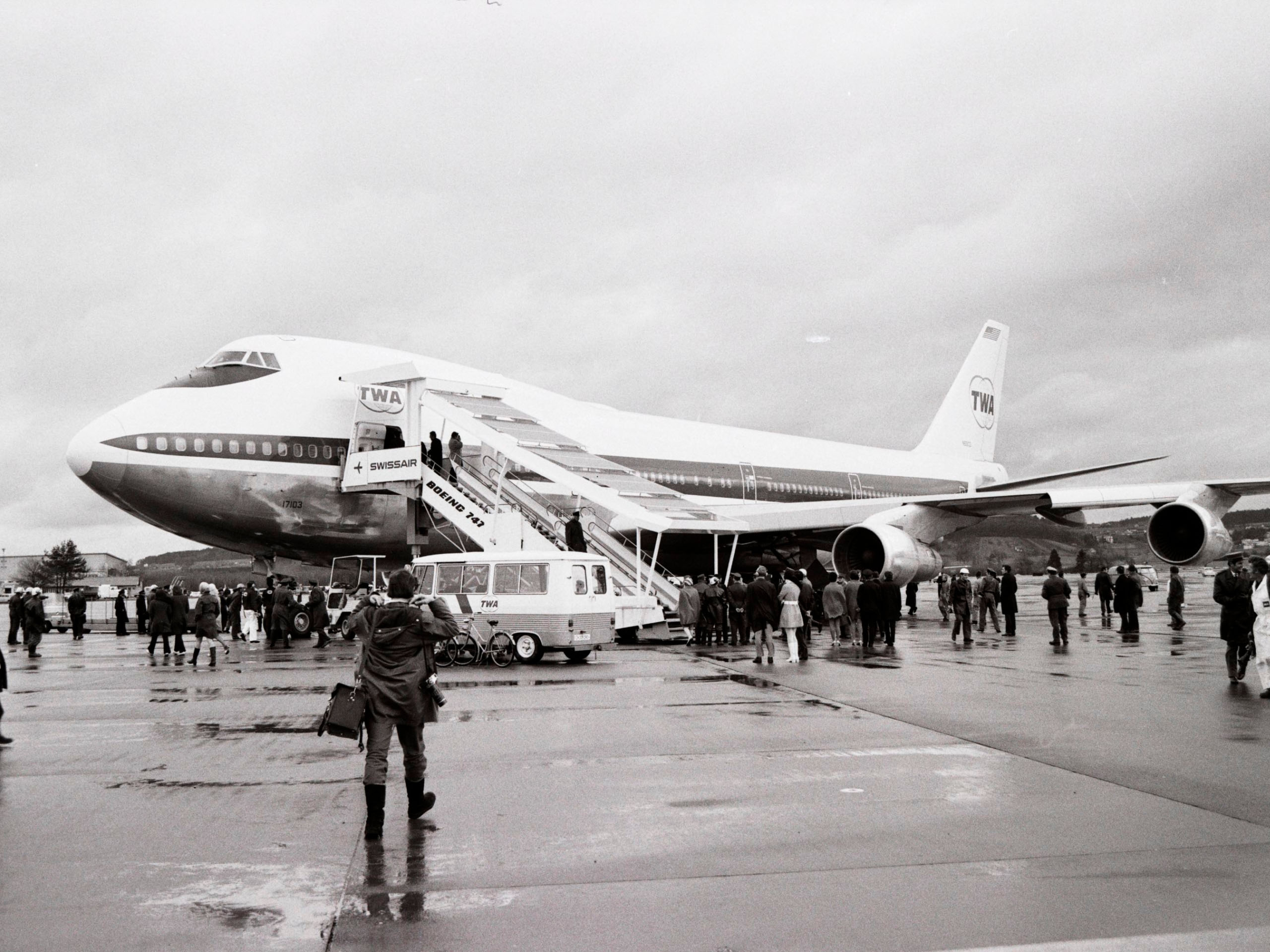 The first jumbo jet lands in Zurich, a Boeing 747 operated by Trans World Airlines (TWA).