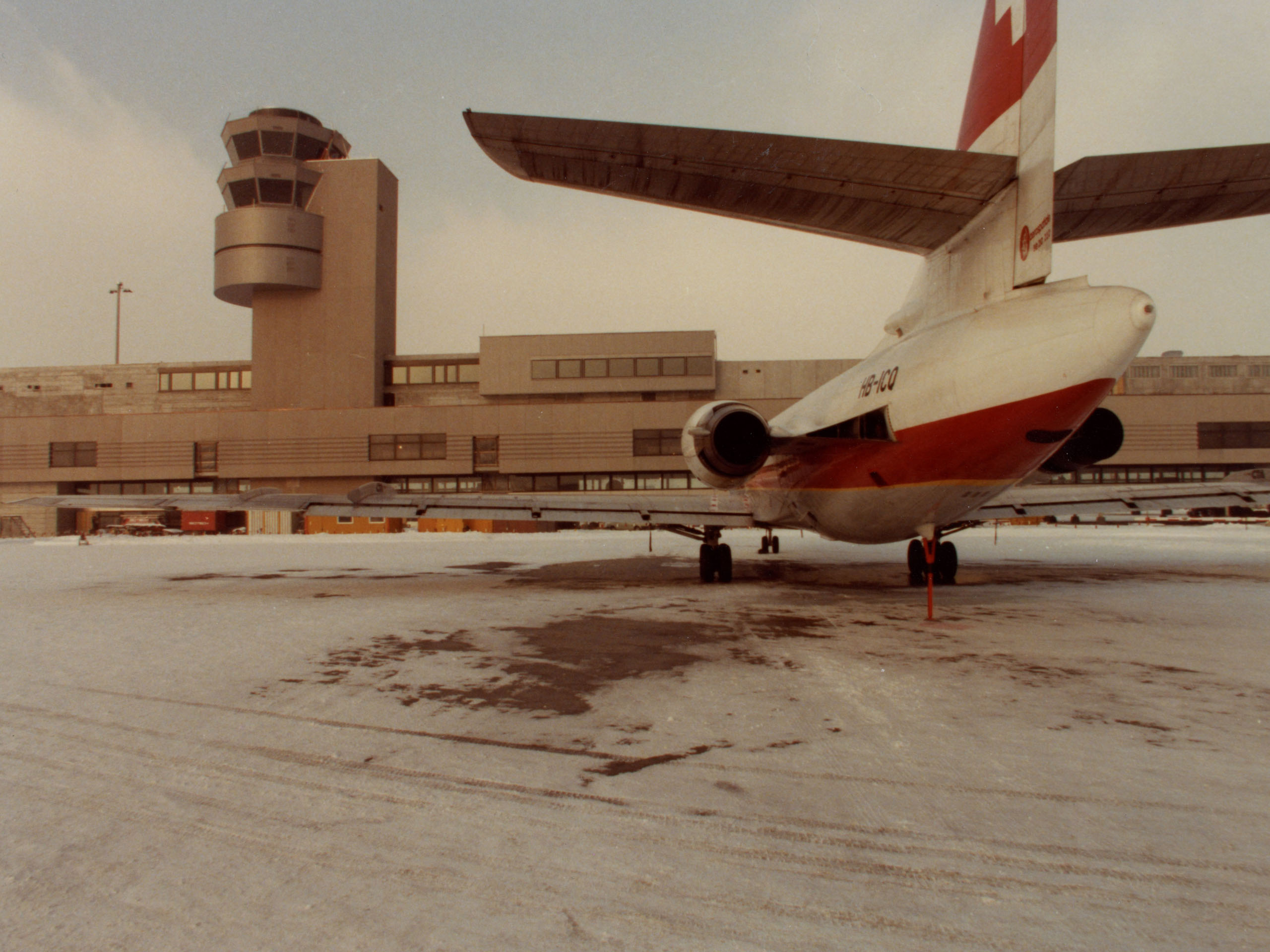 The first official landing of a commercial airliner on the new runway 14/32 is a Swissair Boeing 747 from New York. This V runway forms part of a new three-runway system which includes blind landing runway 16/34 after its renovation.