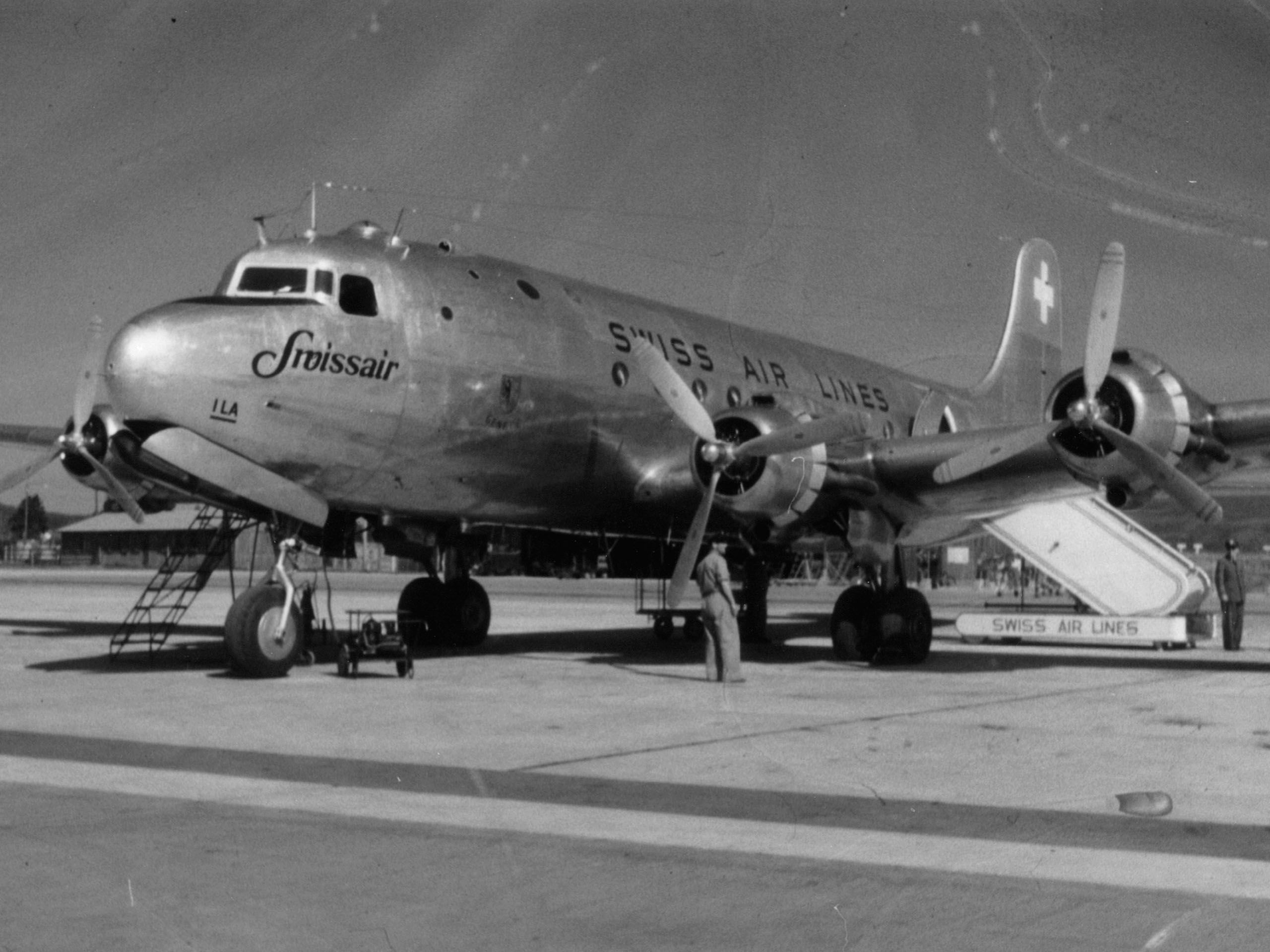 On the day the airport opens, a Swissair Douglas DC-4 from Cairo lands on the west runway 10/28. The first take-off is a DC-4 flight to London. Regular operations commence. Old barrack buildings are temporarily used for passenger handling.