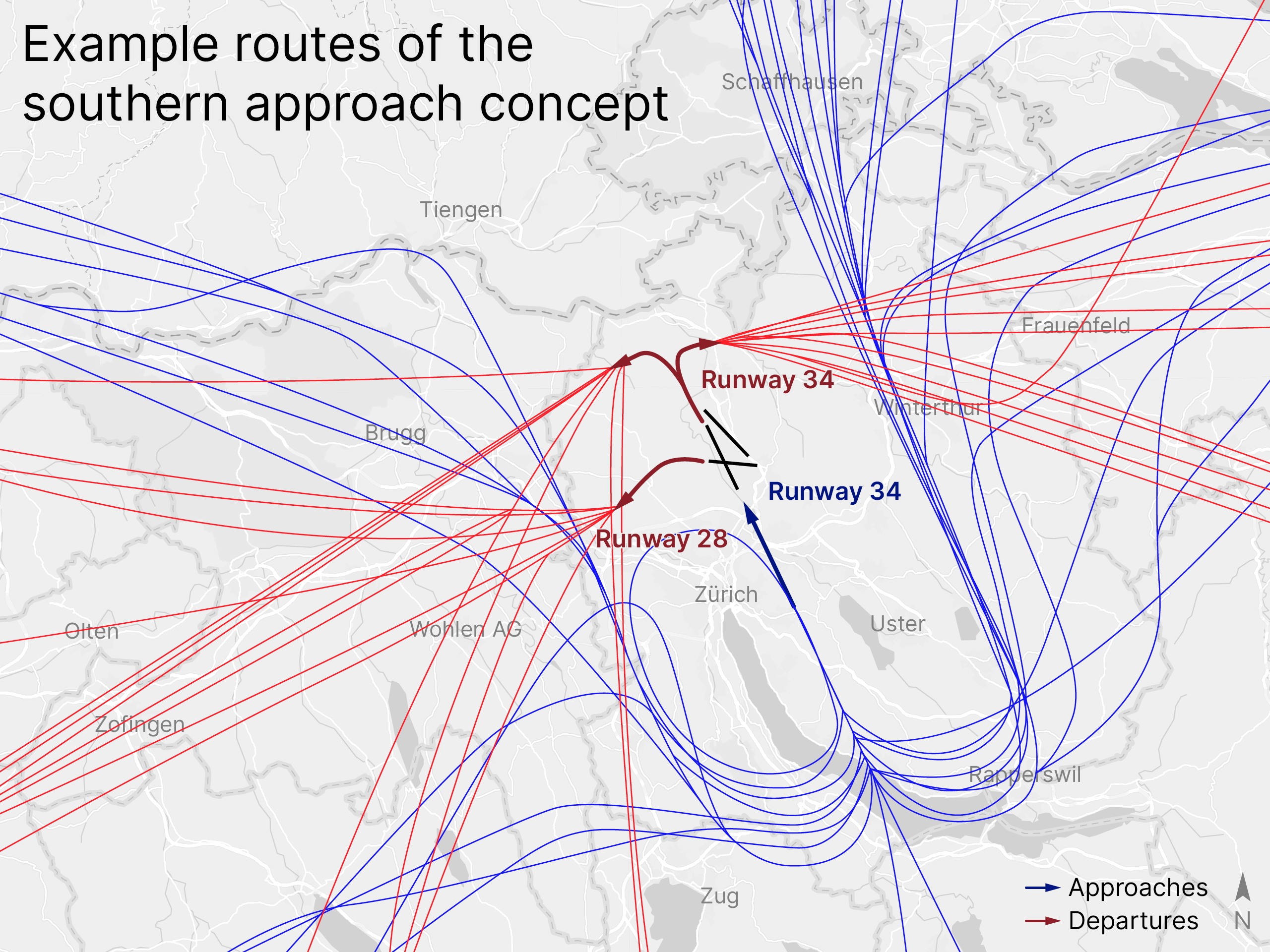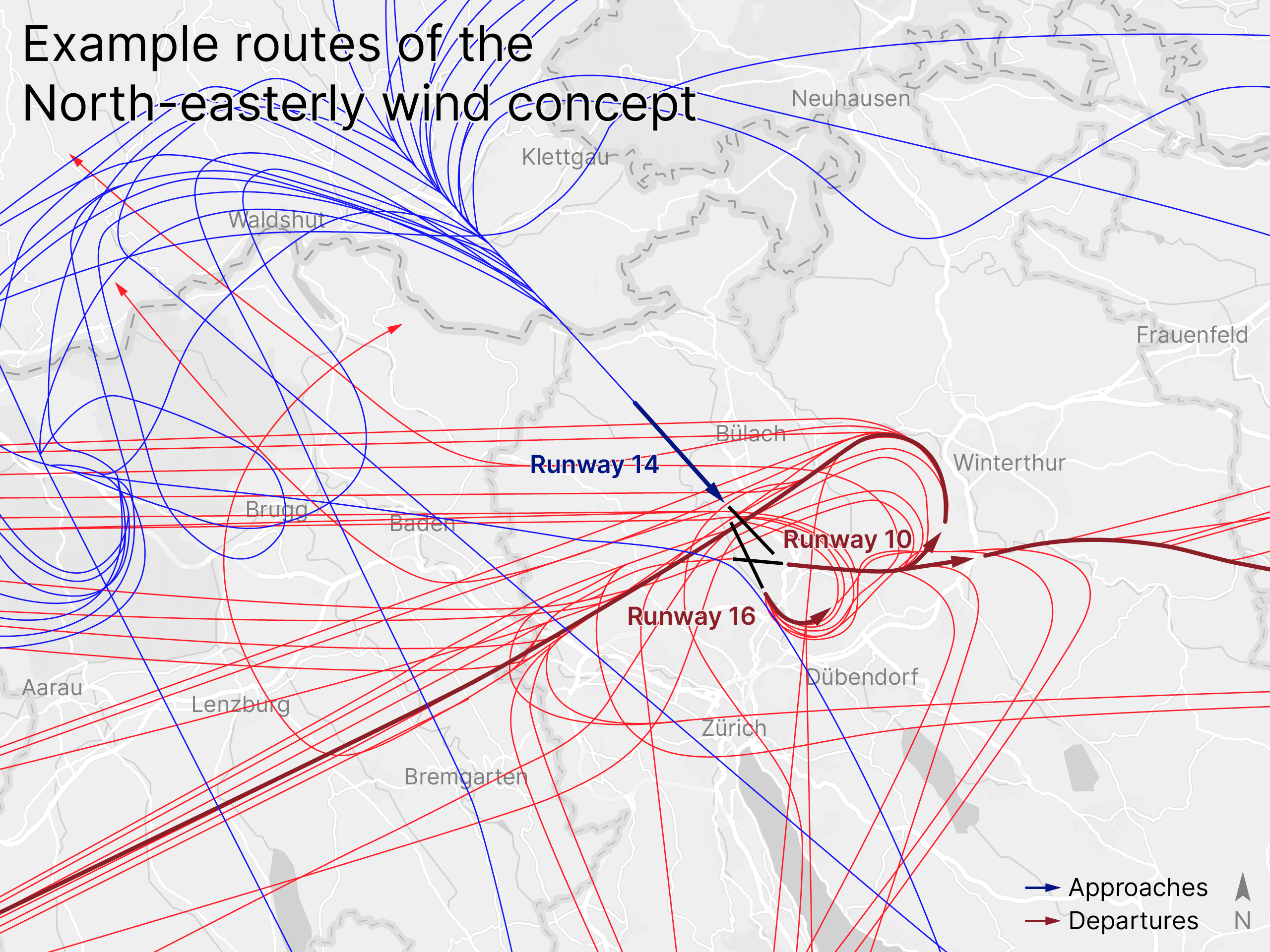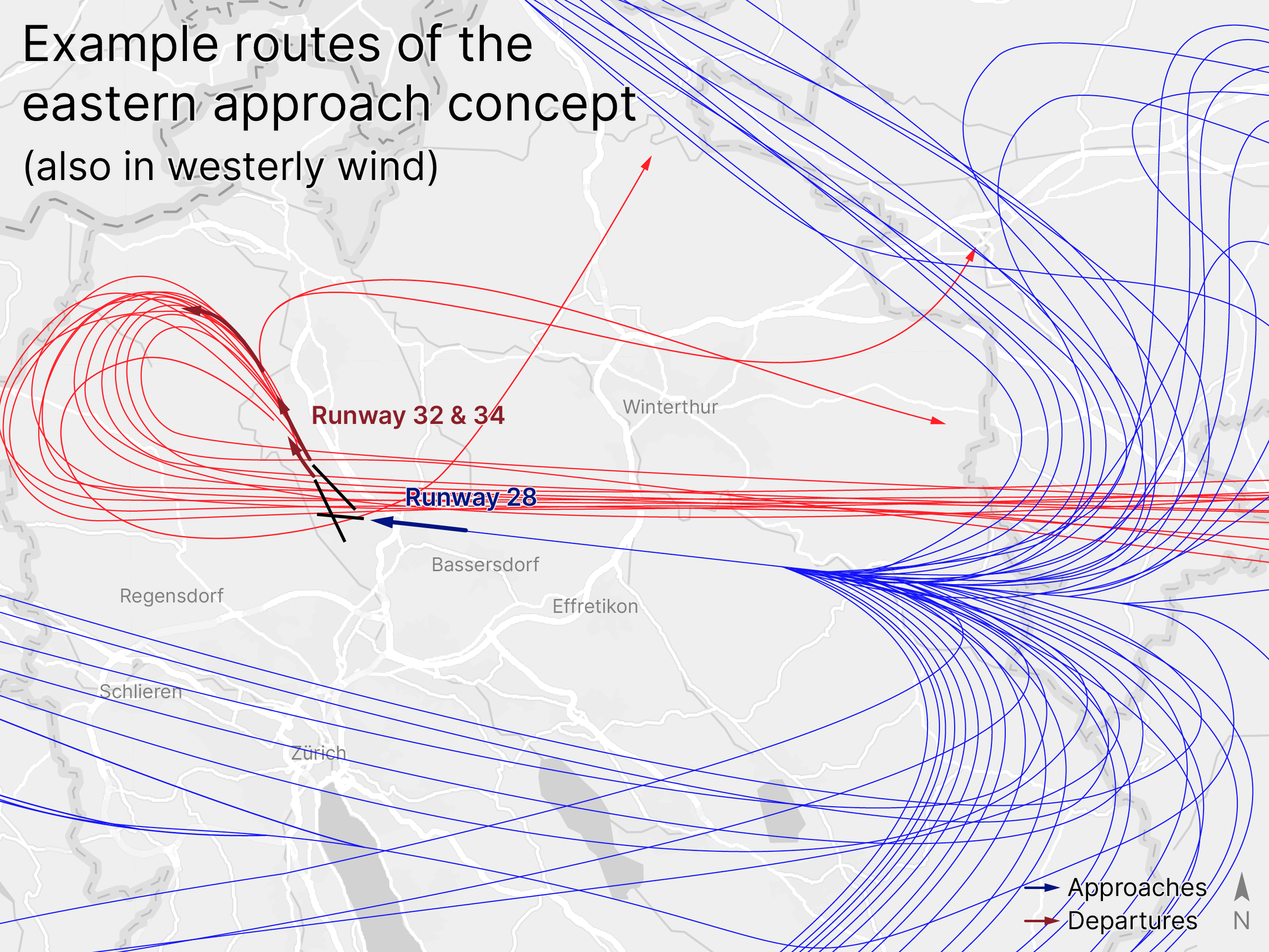 The choice of approach direction depends largely on the current weather situation. Tailwind is avoided because it can destabilize landings. For example, during North-easterly wind conditions (Biswind) in the evening, the southern approach concept with landings on Runway 34 is used, as approaches from the east would otherwise involve tailwind.
