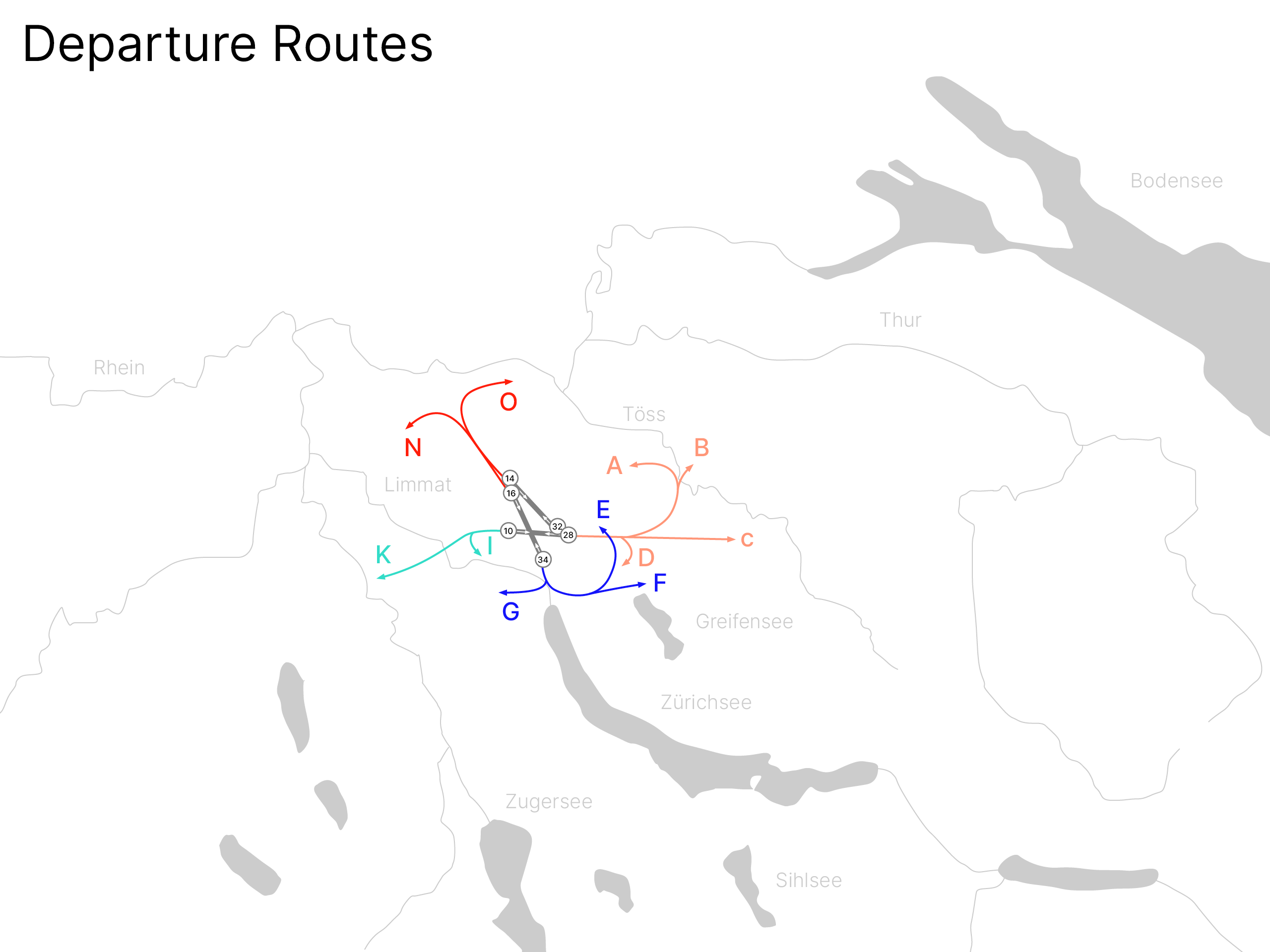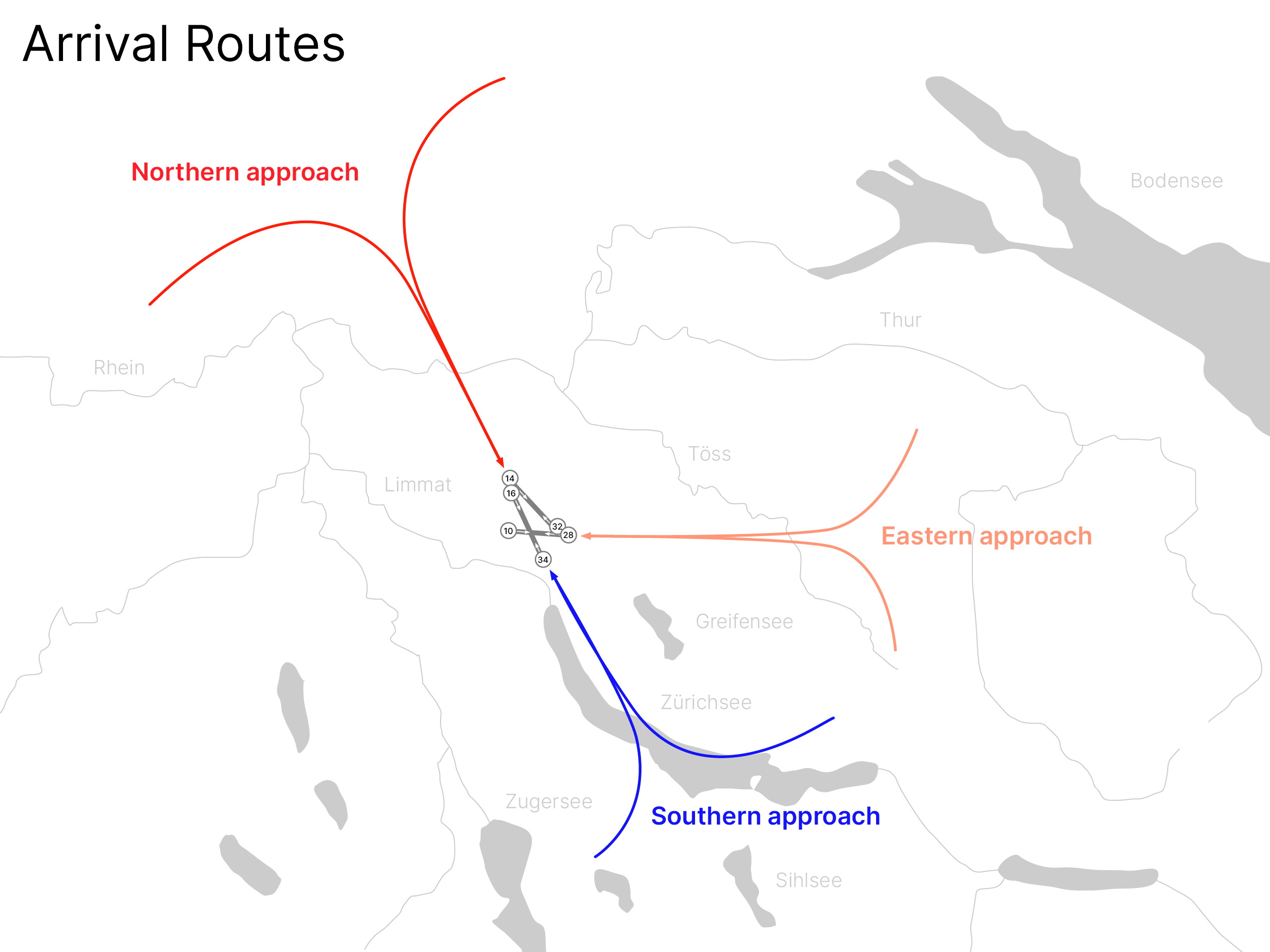 To ensure that aircraft can land safely and reliably at Zurich Airport, the approach routes are clearly defined and flown using modern navigation systems. These routes take into account terrain, weather, wind conditions and safety requirements. Before an aircraft turns onto the final approach path, it is guided along so called transitions. These standardized route segments ensure that aircraft arriving from different directions merge in an orderly way. This keeps traffic stable, well sequenced and predictable, even during busy periods.