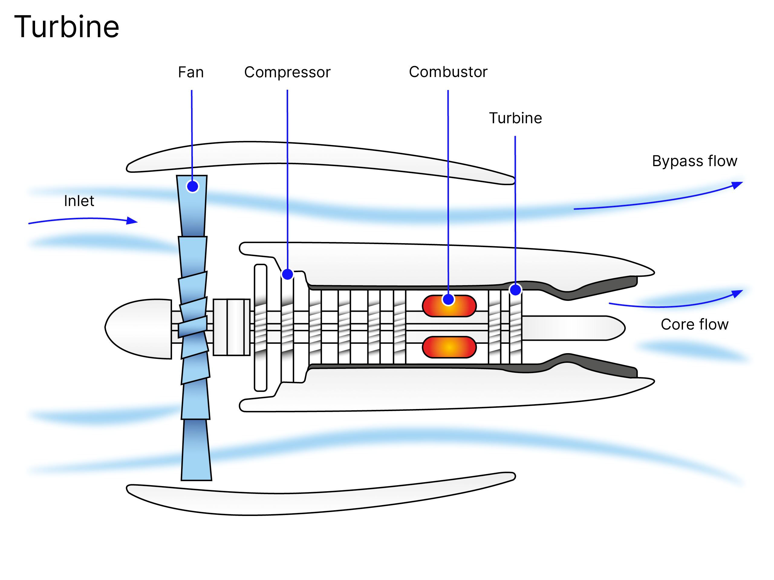 - Core noise: Noise produced by the mechanical and thermodynamic processes in the engine’s compressor and combustion chamber. It becomes more pronounced at high engine power.