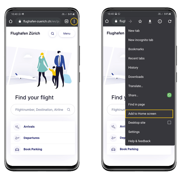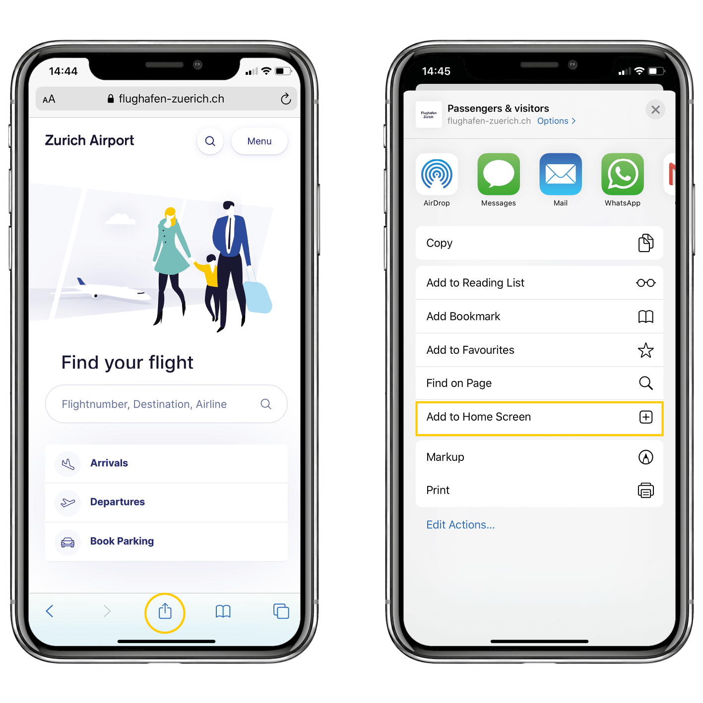Create a shortcut on your home screen in five easy steps. The Zurich Airport website will then appear as an app icon on your home screen and you will be able to use the website like an app.