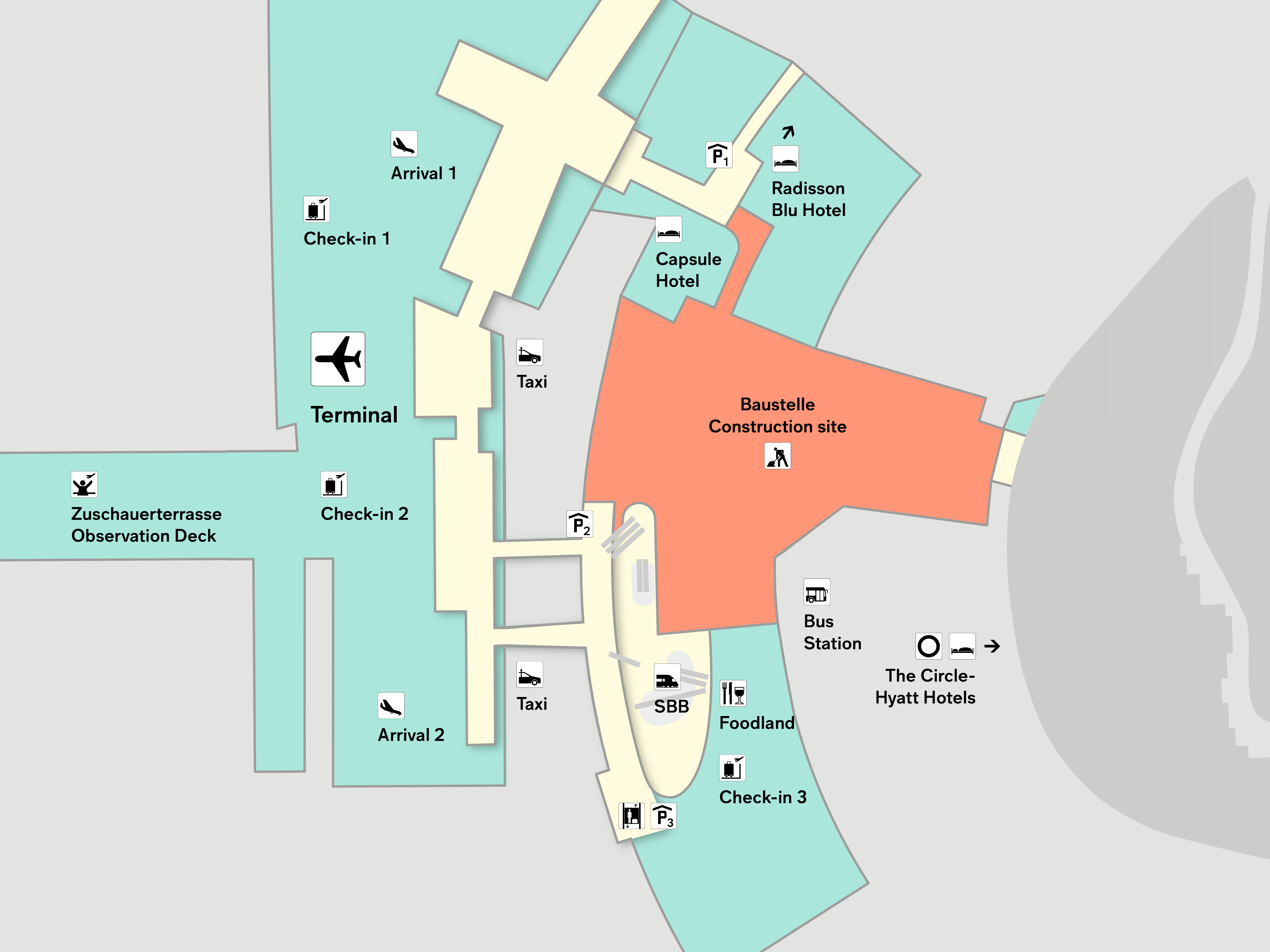 Car park P2 can be accessed via the elevators from Level 01 (Check-in Level 3) and Level 1 (transition to Check-in 2). On Level G0 (Migros level), the elevators to P2 are no longer accessible during the construction period. To reach other levels of the Airport Shopping by elevator on Level G0 (Migros level), the elevators leading to car park P3 are available.