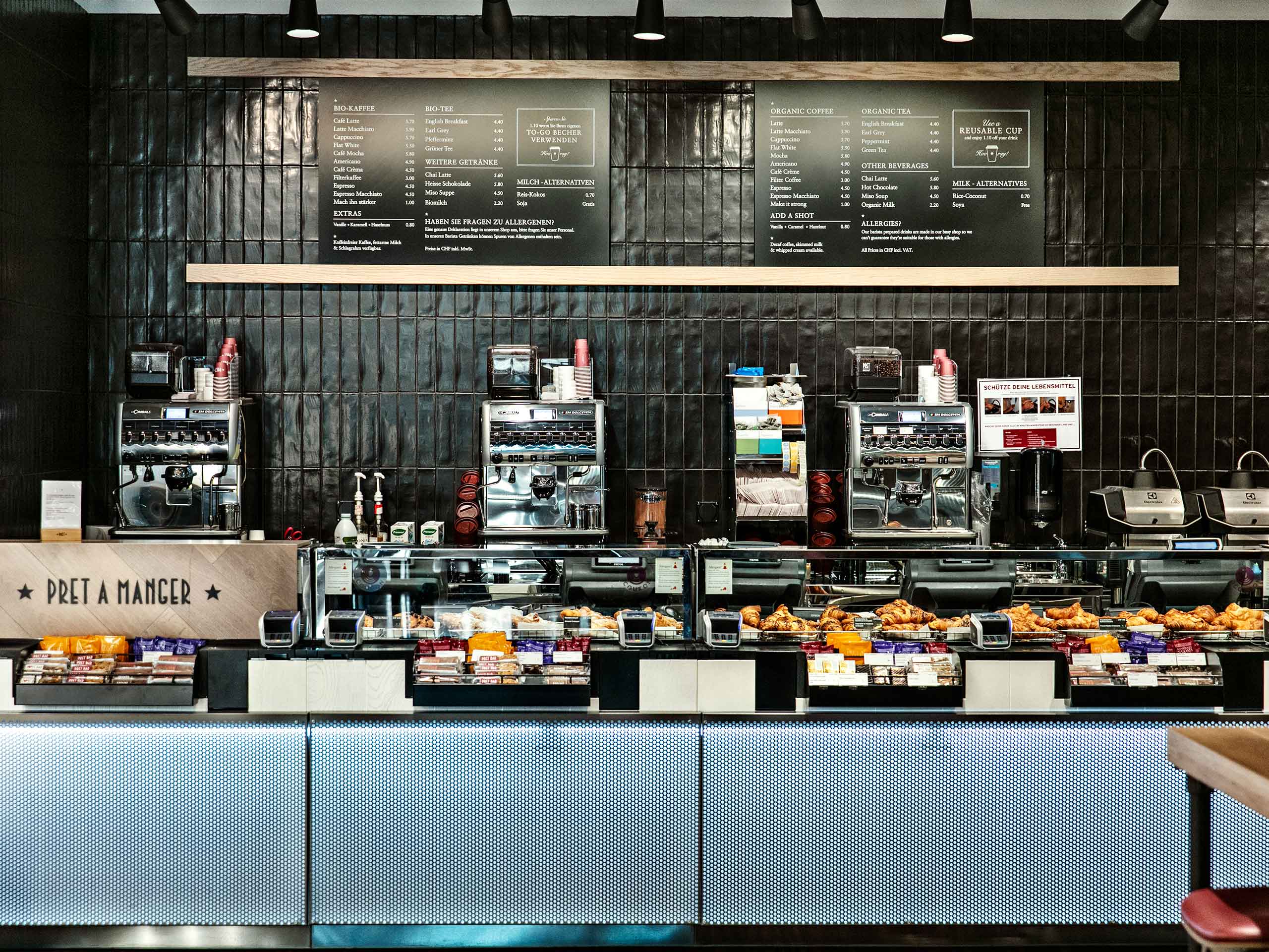 Fresh dishes every day made with choice ingredients – that’s what sets Pret A Manger apart. The international restaurant brand’s rich selection includes traditional sandwiches, wraps and vegan meals as well as hot and cold drinks to consume on the premises or take away.
